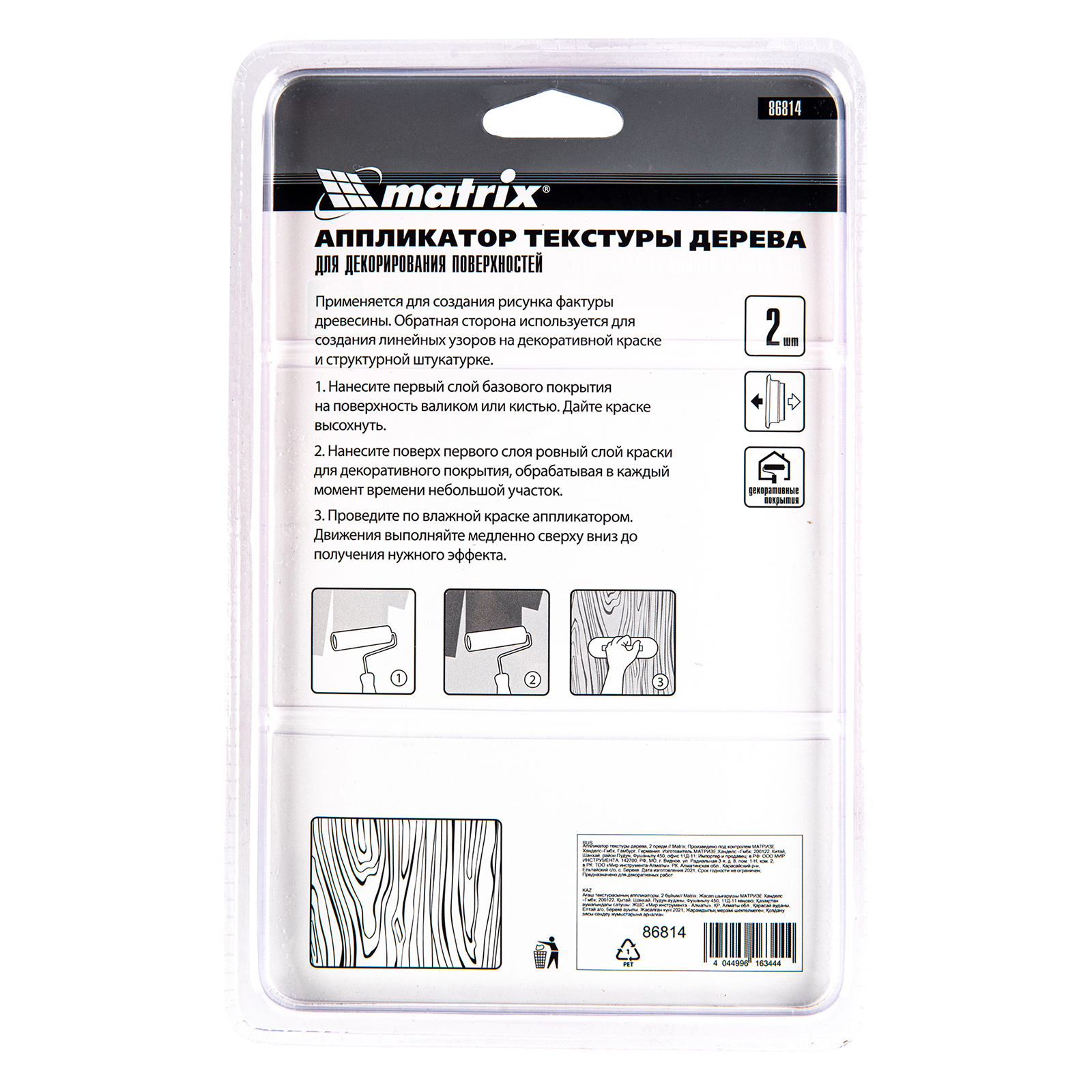 Аппликатор текстуры дерева Matrix 86814, 2 предм., используется на поверхностях из металла, пластика и других. Применяется для нанесения декоративных узоров — создает рисунок фактуры древесины. Обратную сторону аппликатора можно использовать для создания линейных узоров на декоративной краске и структурной штукатурке.