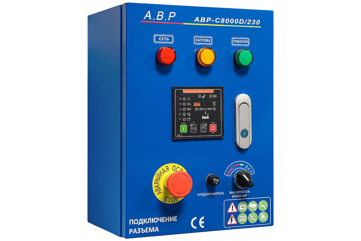 Блок АВР для дизельного генератора от 5 до 8 кВт/230 включает в себя систему автозапуска (автоматического ввода резервного электропитания). При появлении основного источника электропитания происходит отключение электростанции. Блок автоматического управления для контроля наличия напряжения в сети.