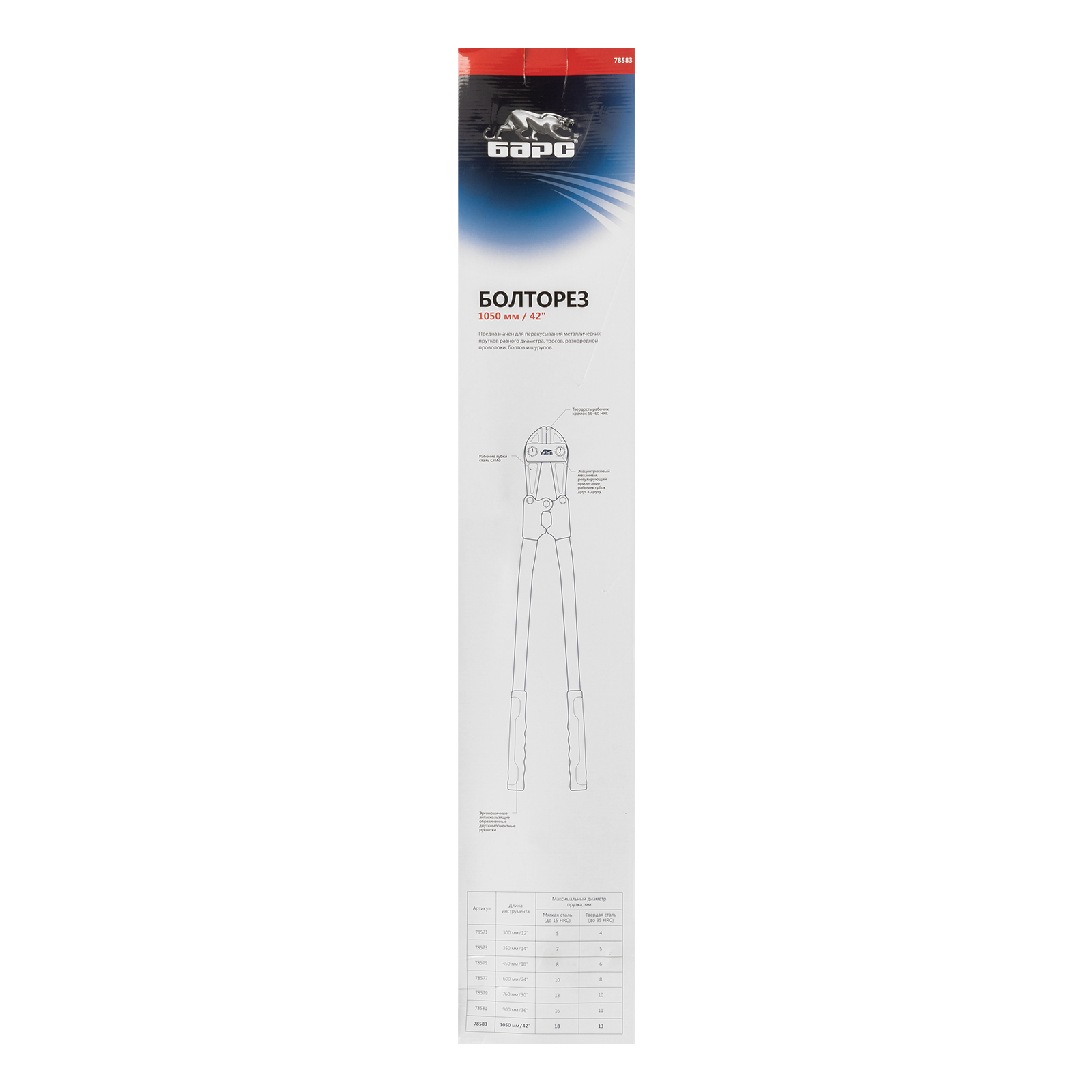 Болторез Барс 78583 длиной 1050 мм (или 42 дюйма) предназначен для перекусывания цепей, арматур, болтов, прутков, замков из стали толщиной не более 13 мм. Используется не только в быту, но и в промышленности, строительстве и спасательных работах.