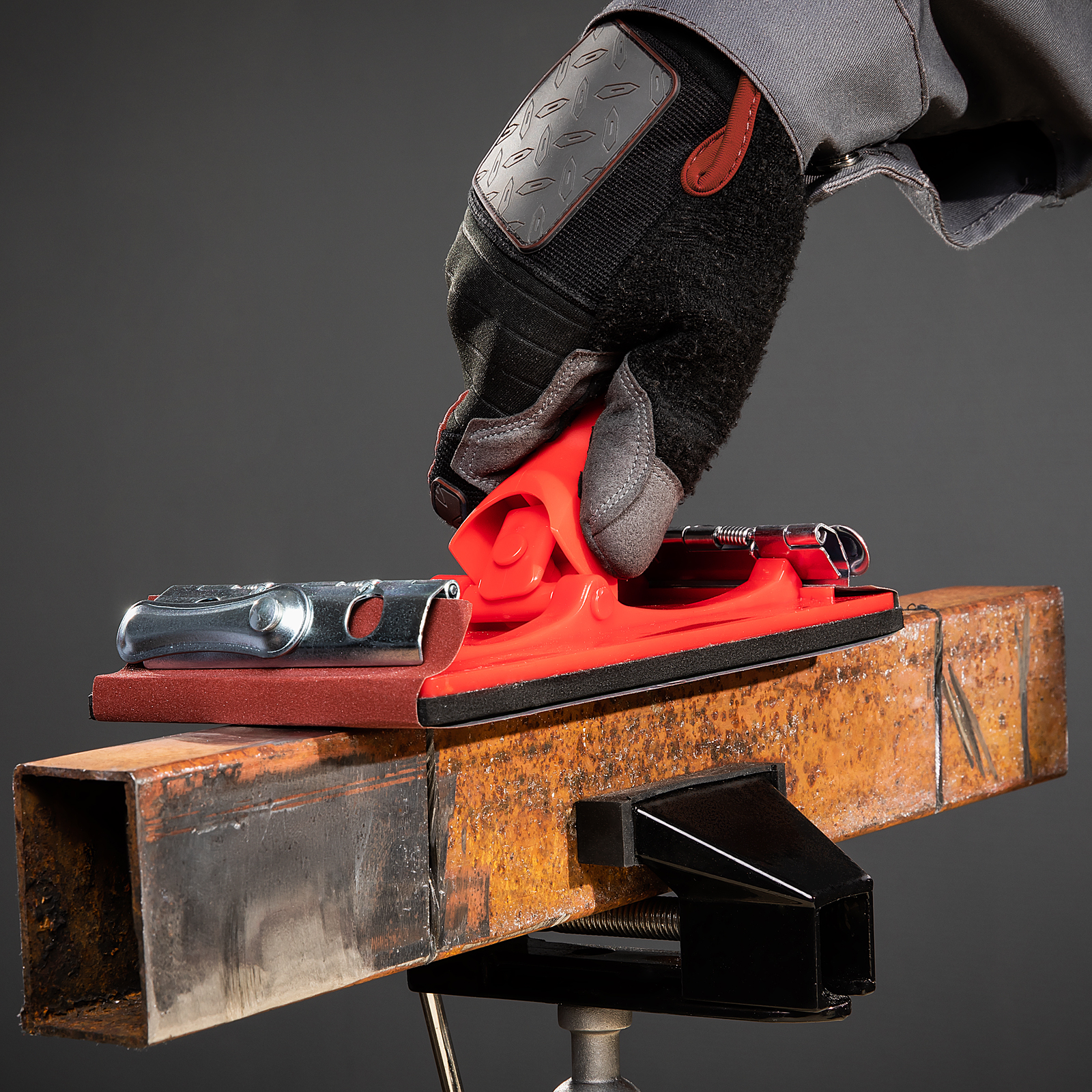 - Быстрая замена оснастки — шлифлист или сетка прочно фиксируется стальными зажимами.