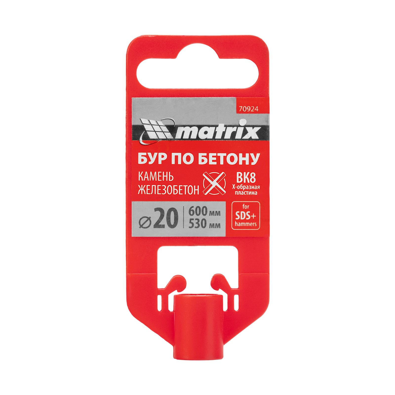 Бур по бетону Matrix 70924 длиной 600 мм, с хвостовиком SDS-plus и крестовой пластиной, предназначен для получения отверстий диаметром 20 мм в бетоне, камне и кирпиче. Крестовая пластина обеспечивает эффективную работу с твердыми материалами, в том числе армированным бетоном. Бур устанавливается в патрон перфоратора и используется во время проведения строительных работ.