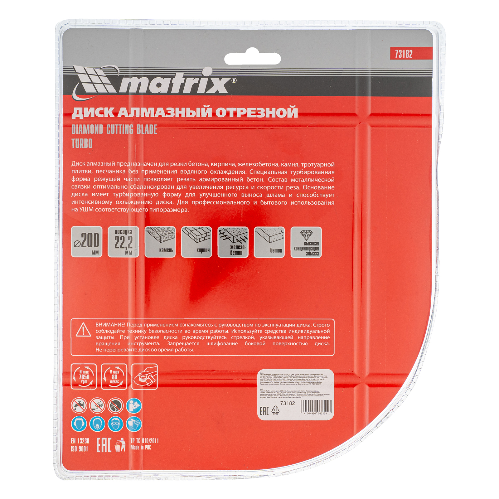 Отрезной алмазный диск Matrix Turbo 73182 диаметром 200 х 22,2 мм, предназначен для сухой резки. Используется в качестве сменной оснасткой для углошлифовальных машин (УШМ) во время ремонта и мелкого строительства, а также в быту. Позволяет работать по бетону, в том числе свежему и среднеармированному, камню и кирпичу.