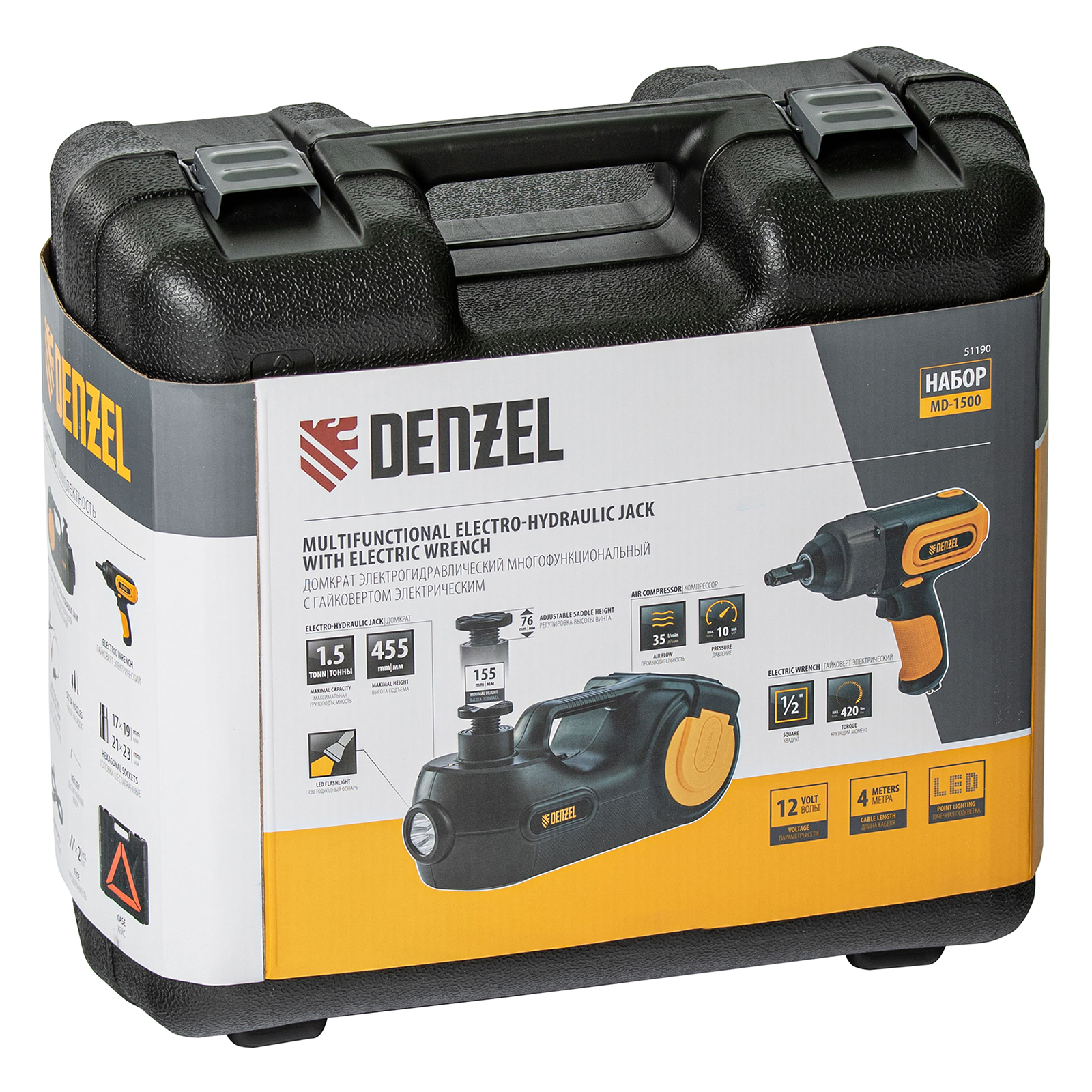 Домкрат электрогидравлический «3 в 1» (1,5 т), 12В, с гайковертом электрическим, в наборе Denzel