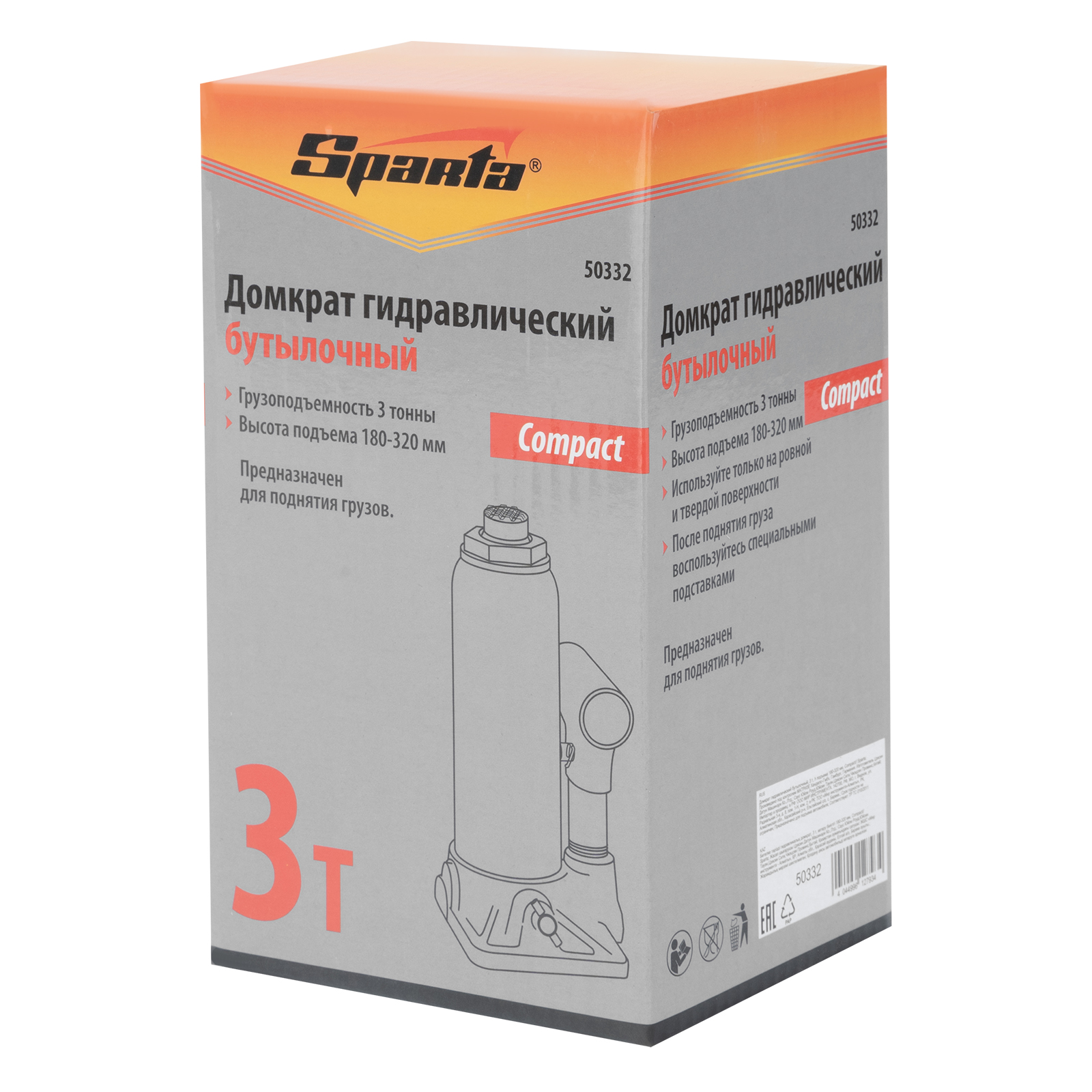 Домкрат гидравлический бутылочный 3т, h подъема 180-320 мм Sparta Compact