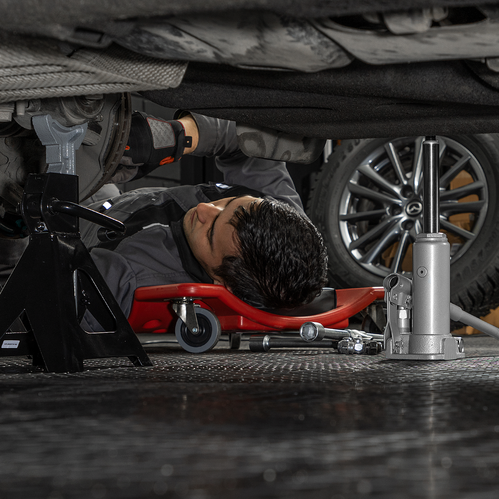 - Удобное хранение и транспортировка — домкрат поставляется в прочном пластиковом кейсе с ручкой.