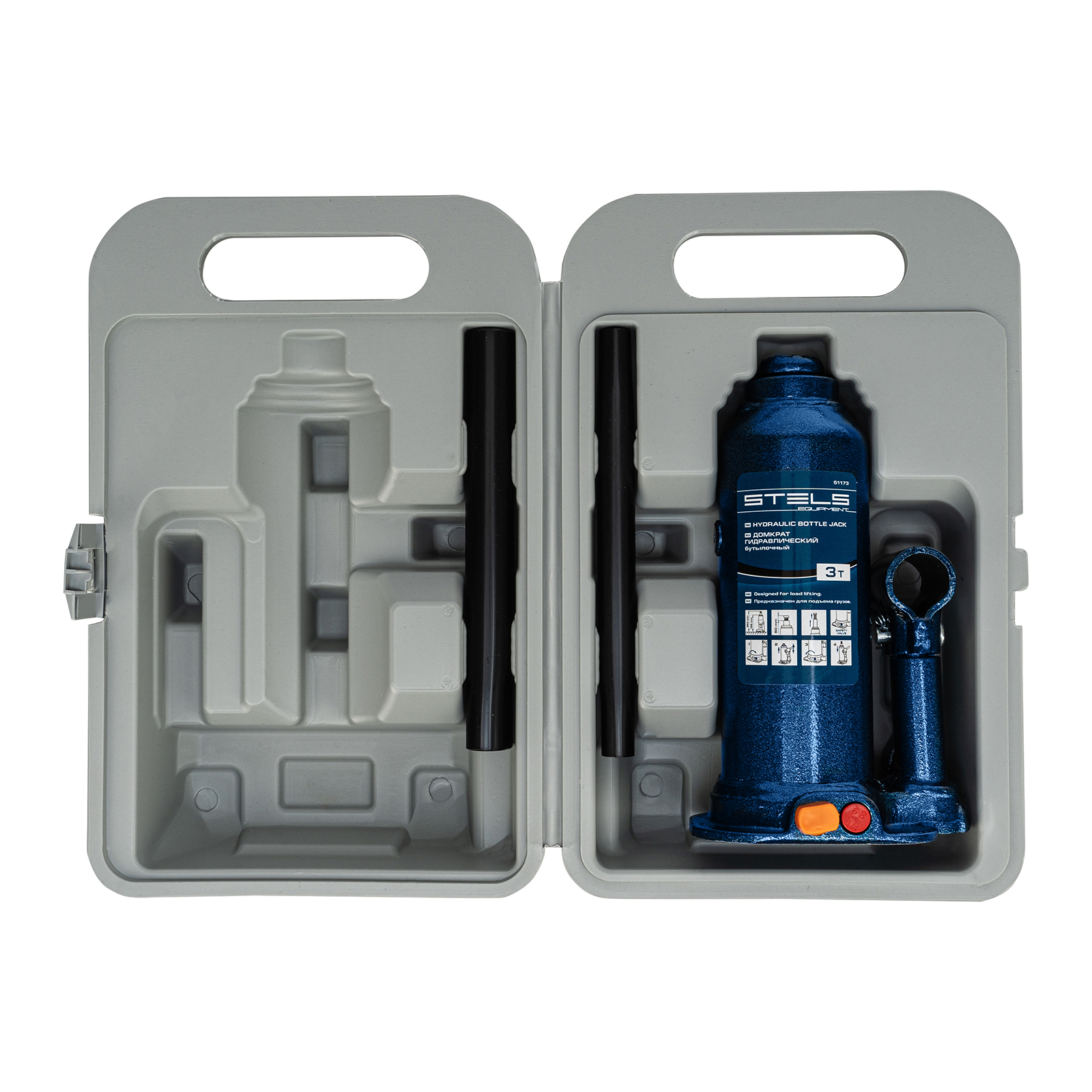 Гидравлический бутылочный домкрат Stels 51173 в пластиковом кейсе предназначен для поднятия грузов весом до 3 т на высоту 188-363 мм. Он не занимает много места и легко помещается в багажник, поэтому его можно брать с собой в дорогу или хранить в гараже. Используется для самостоятельного ремонта авто, также подходит для профессионального применения на станциях технического обслуживания.
