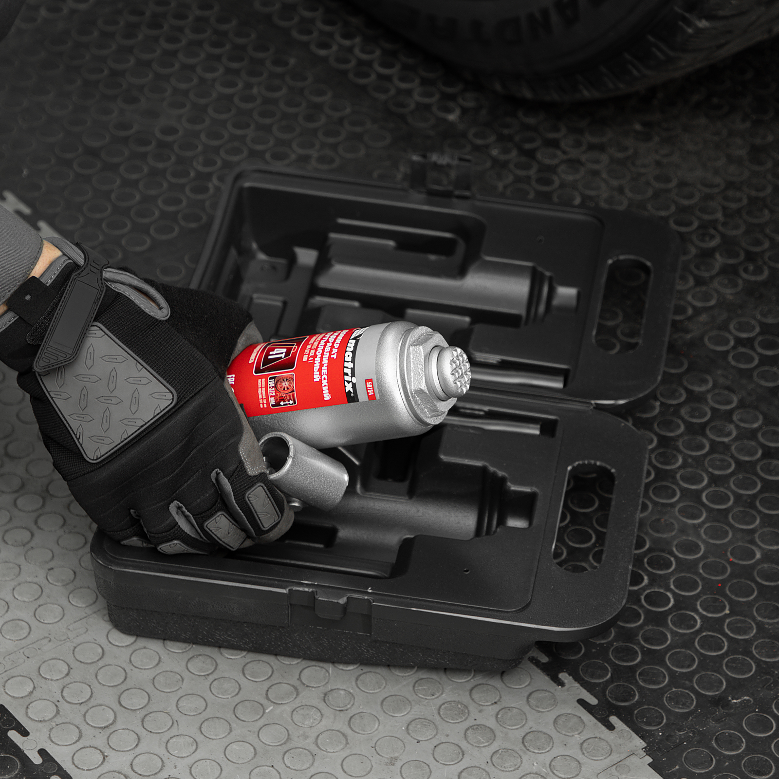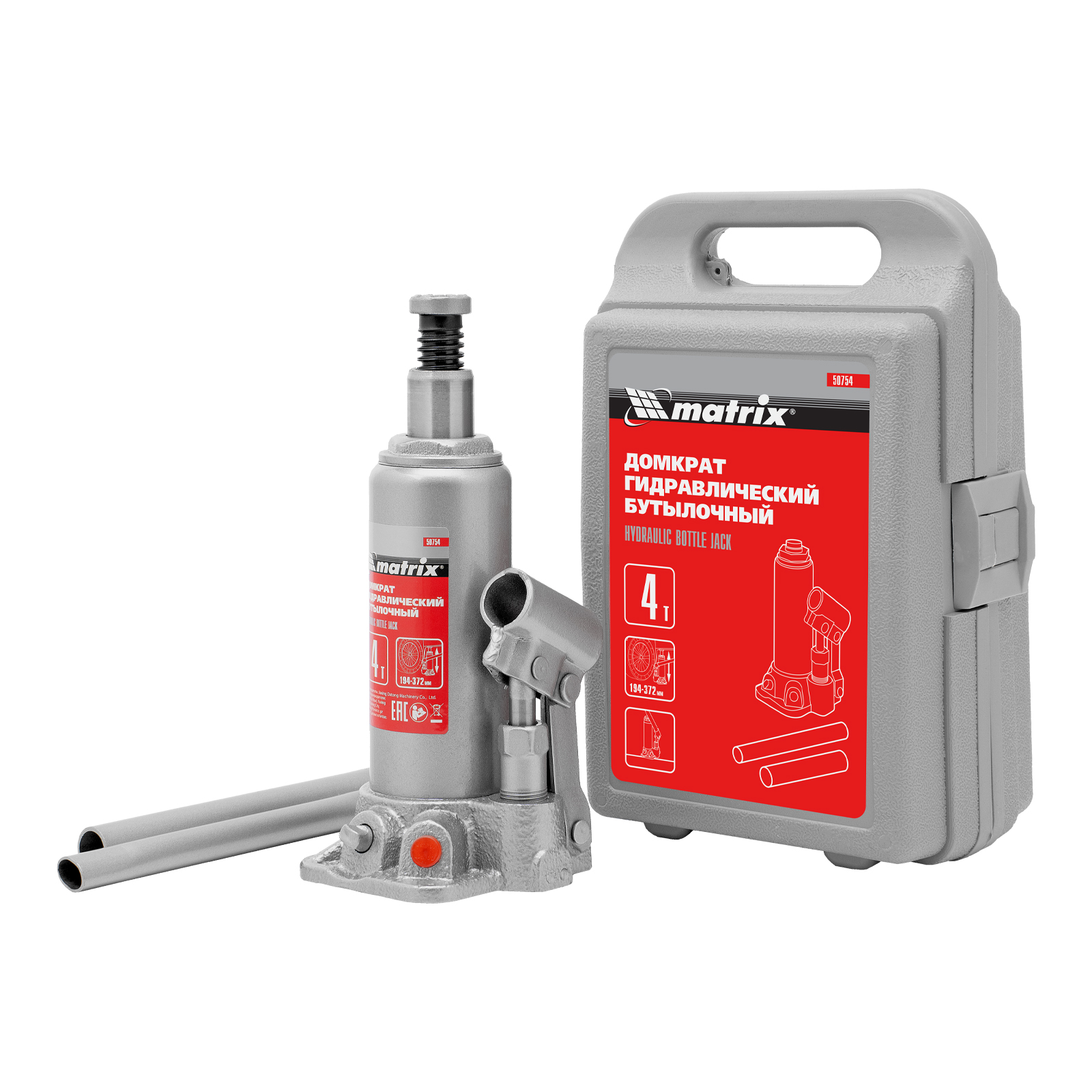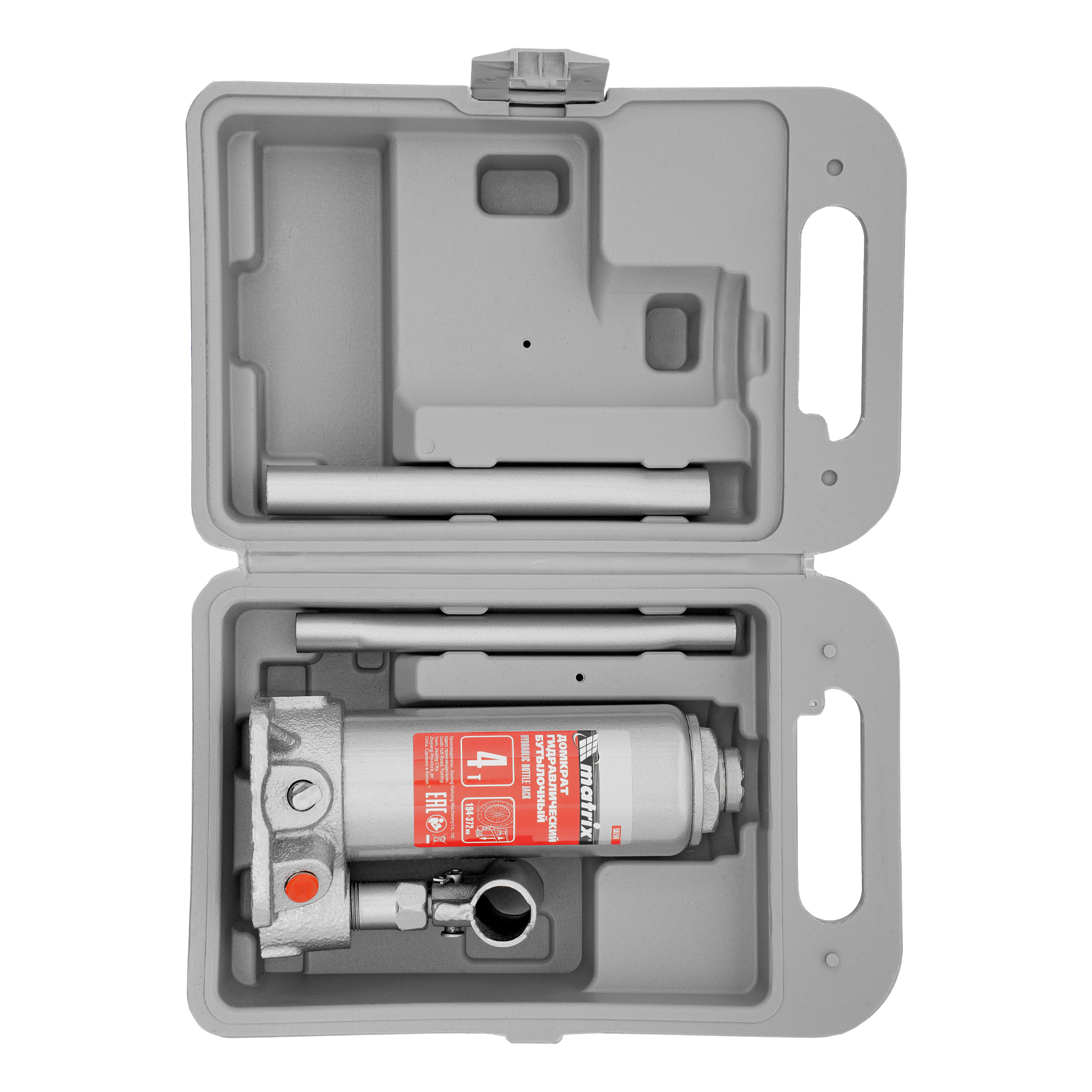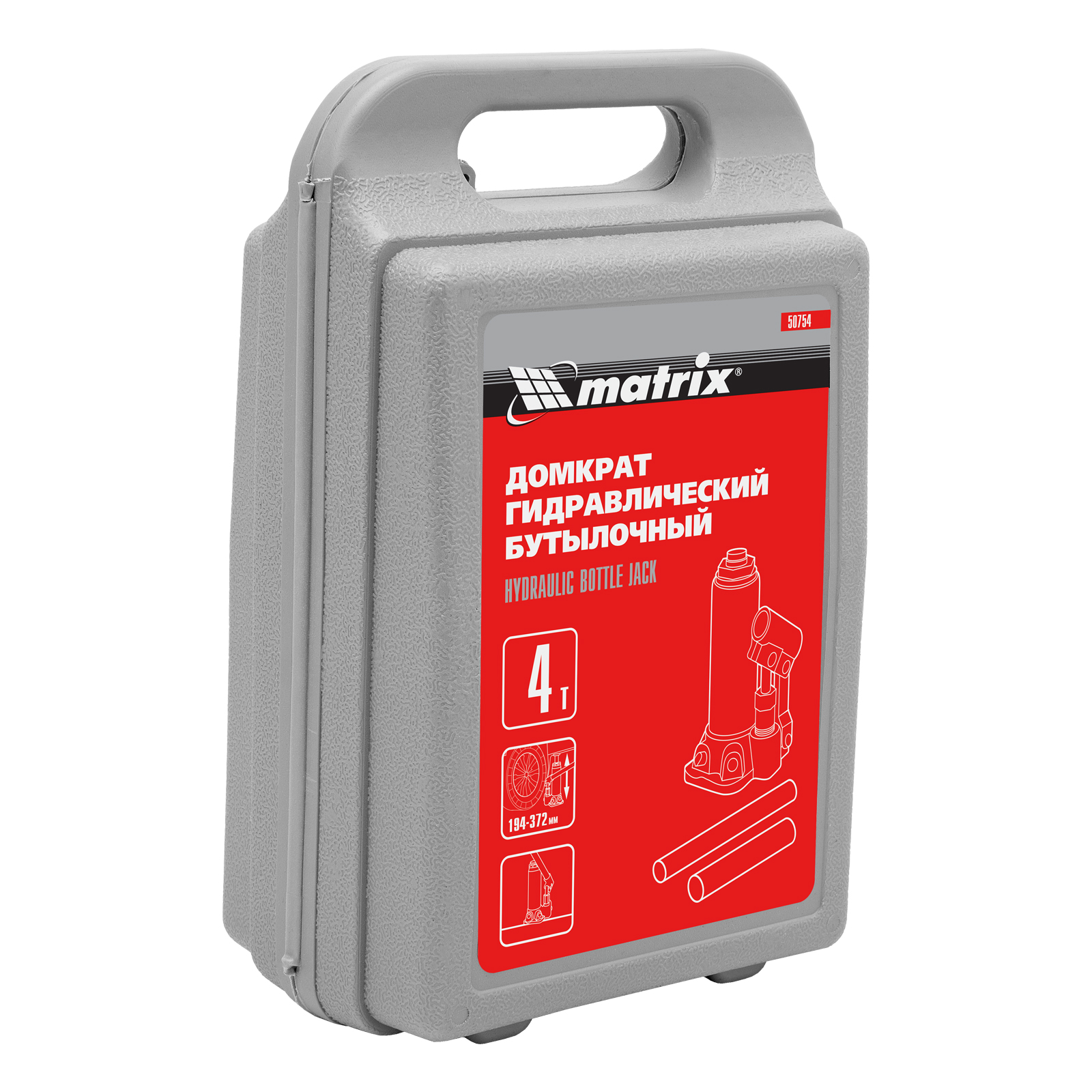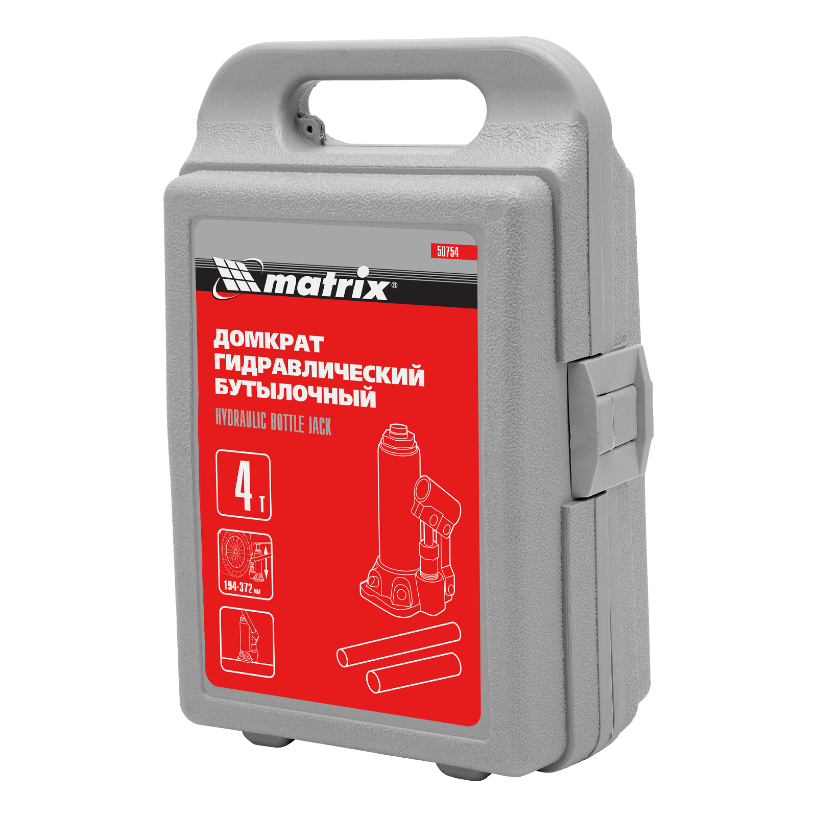 Домкрат гидравлический бутылочный, 4 т, высота подъема 194-372 мм, в пластиковый кейсе Matrix