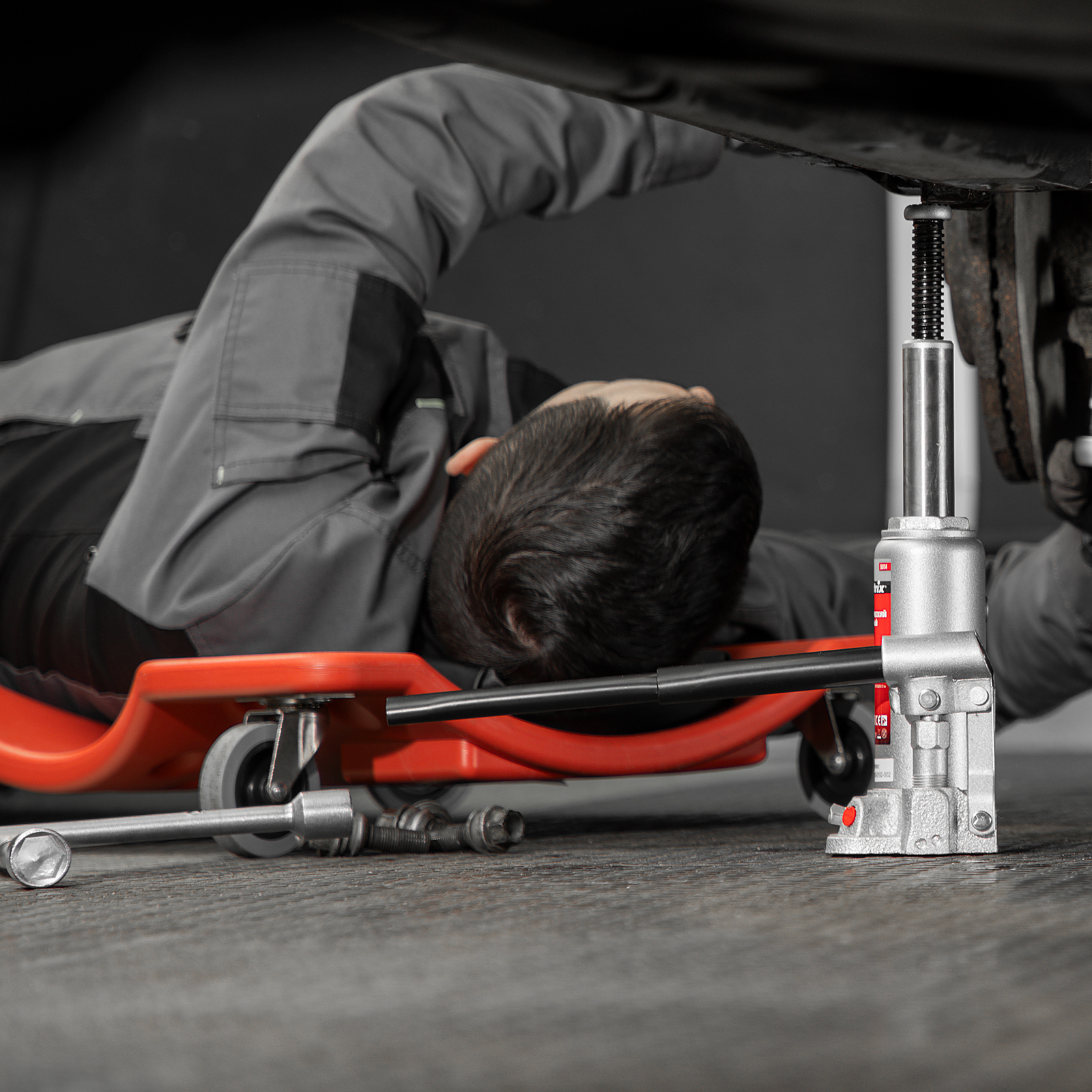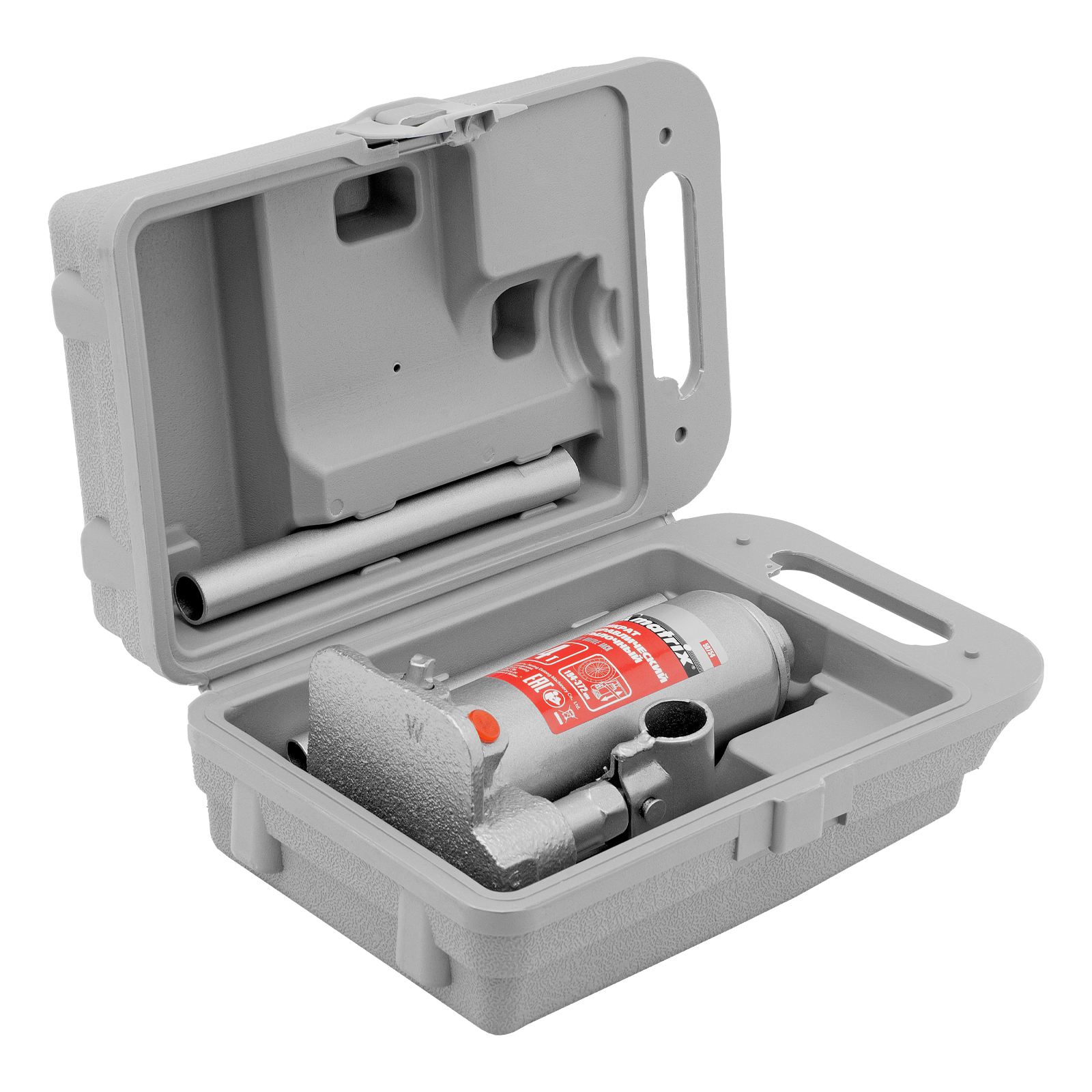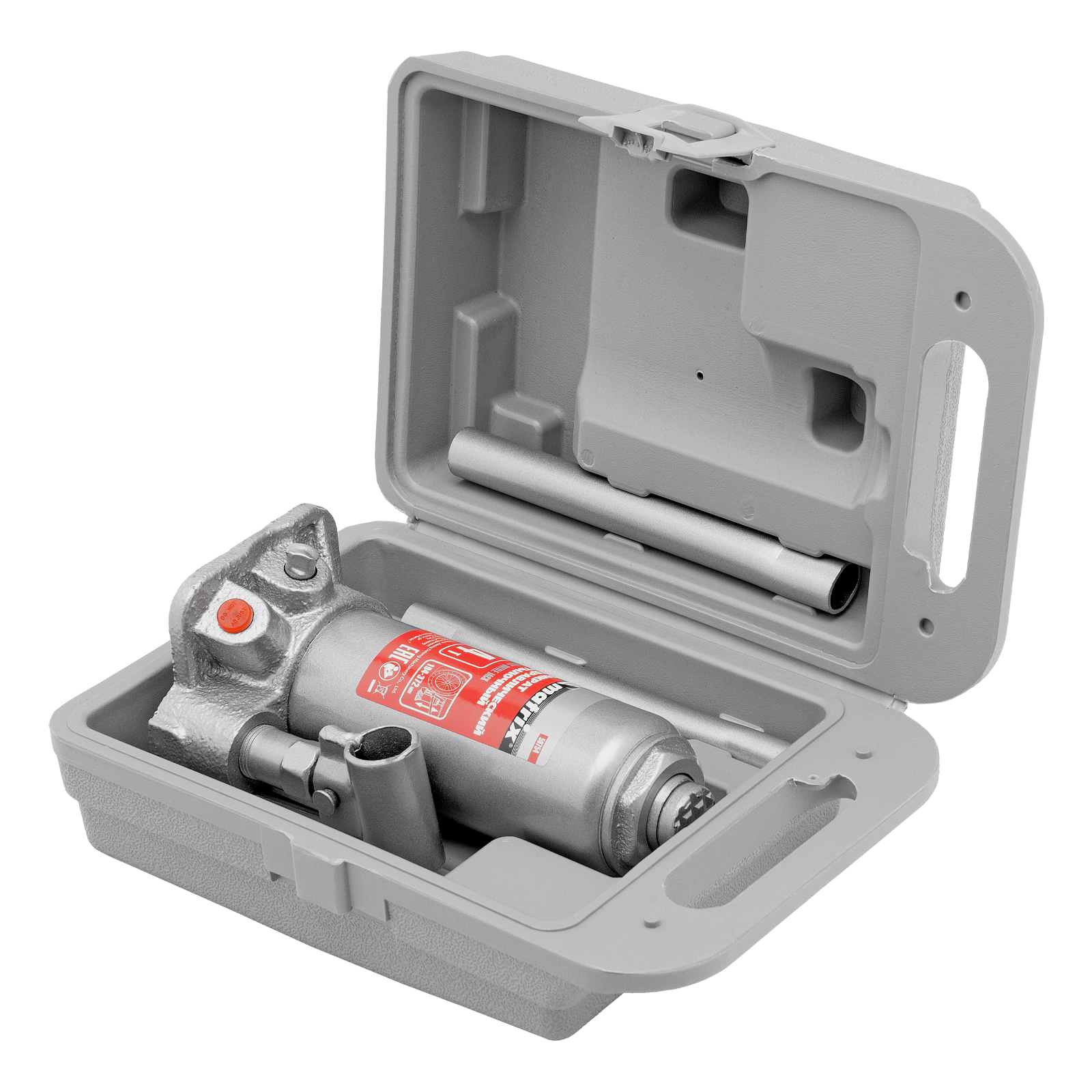 - Удобное хранение и транспортировка — домкрат поставляется в прочном пластиковом кейсе с ручкой.