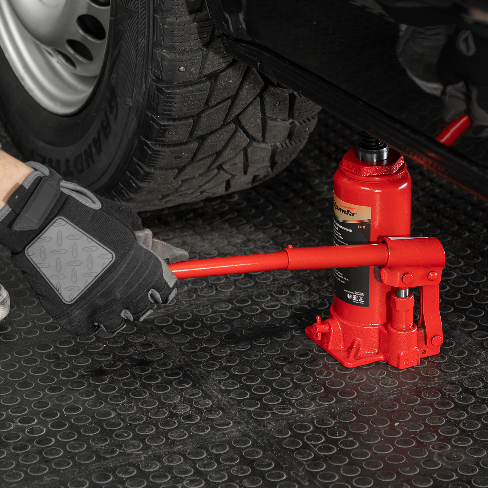 Гидравлический бутылочный домкрат Sparta 50323 рассчитан на подъем грузов весом до 5 т на высоту от 195 до 380 мм. Он пригодится как автолюбителям в гараже, так и профессиональным мастерам в автосервисах. Домкрат обеспечивает плавный подъем груза без особых усилий со стороны пользователя.