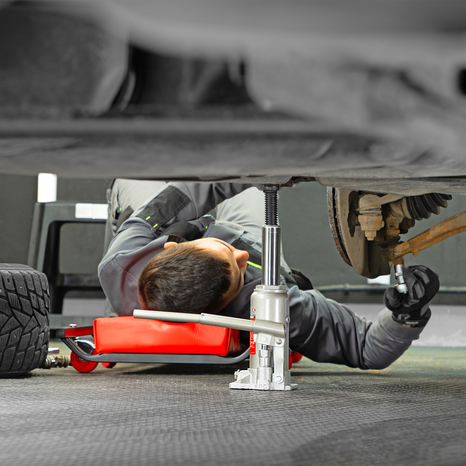 - Удобная транспортировка — домкрат комплектуется прочным пластиковым кейсом.