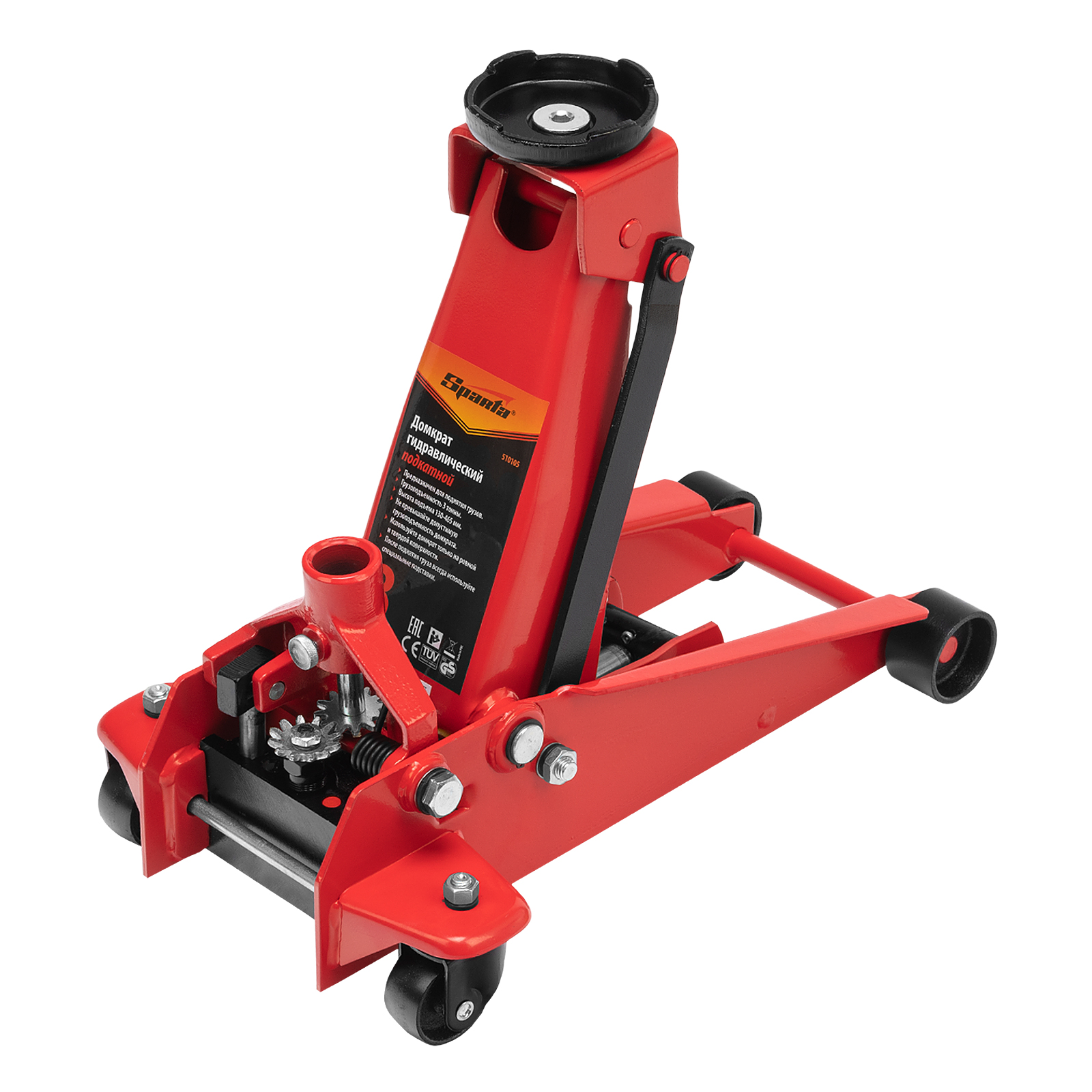 Гидравлический подкатной домкрат Sparta 510105 с высотой подъема 130 мм используется для подъема автомобилей массой до 3 тонн на высоту до 465 мм для их ремонта и обслуживания. Подходит для автомашин со стандартным клиренсом. Домкрат входит в оснащение гаражей и автосервисов.