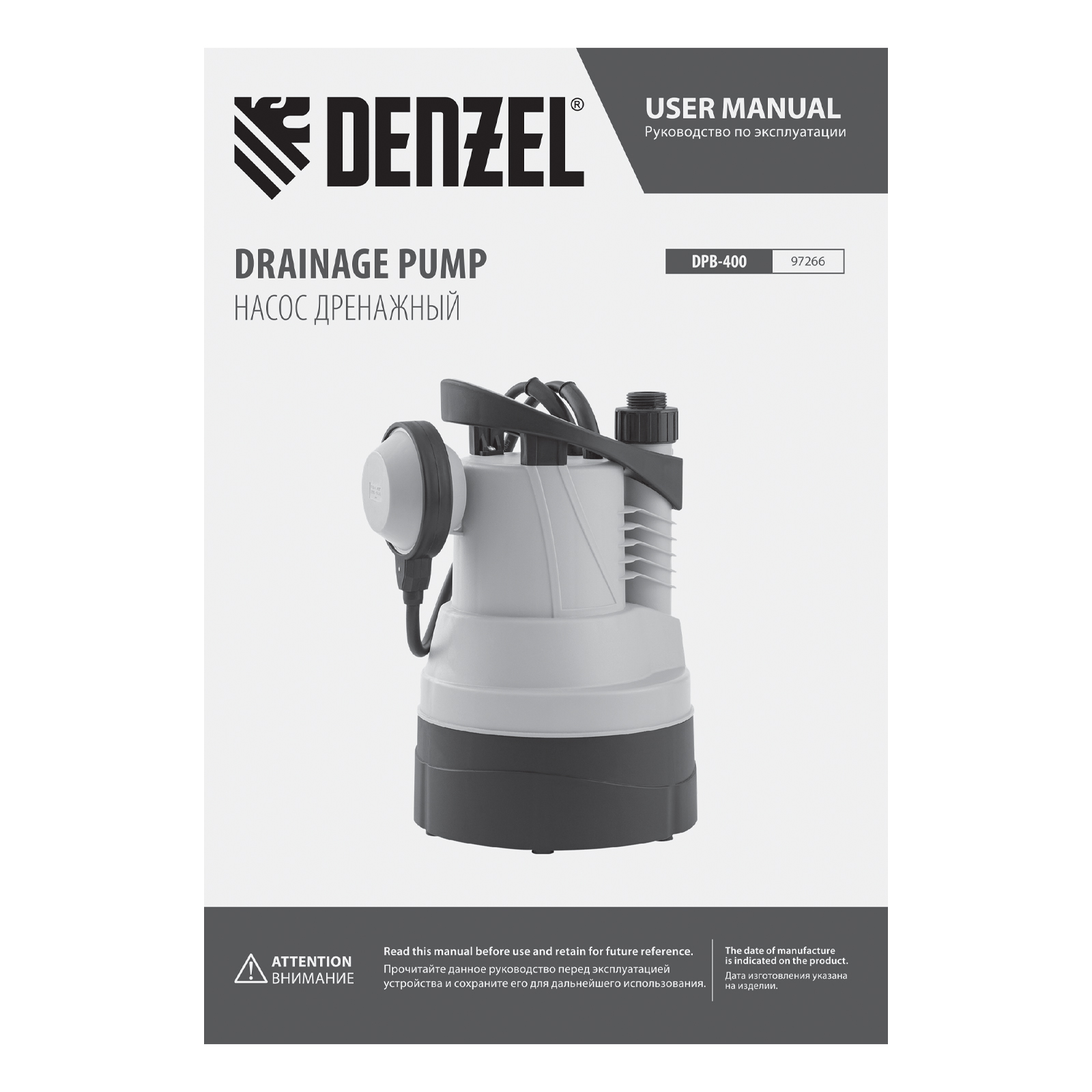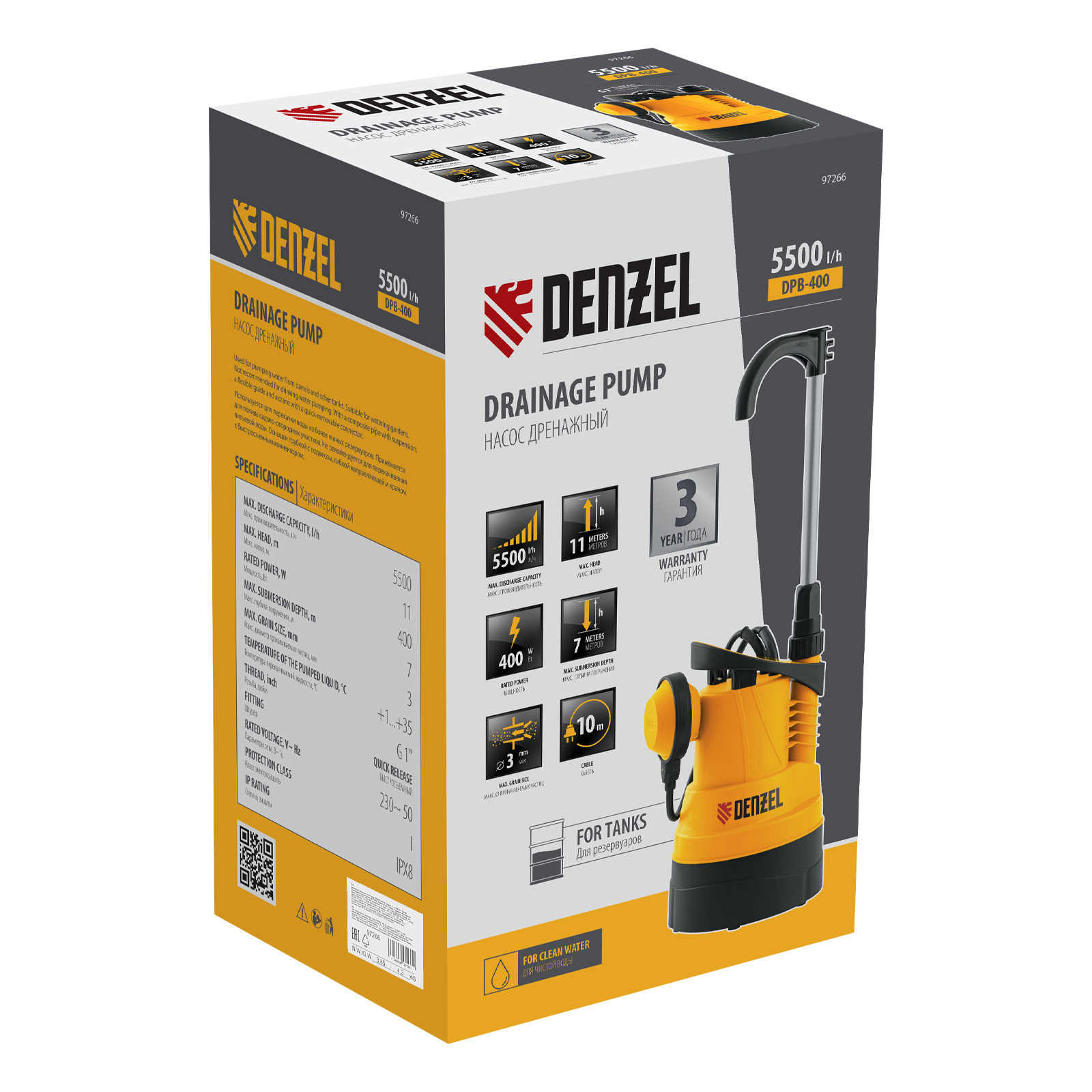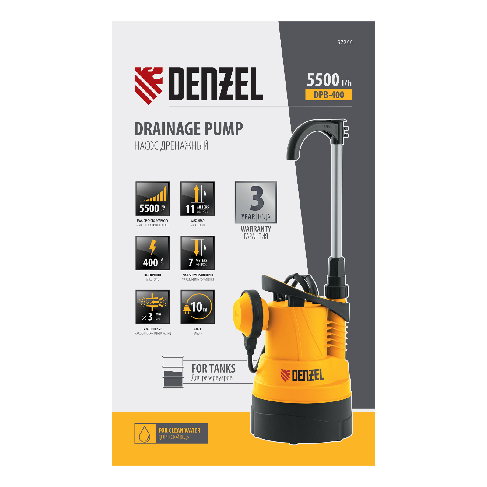 Дренажный насос для чистой воды DPB400, 400 Вт, подъем 11 м, 5500 л/ч Denzel