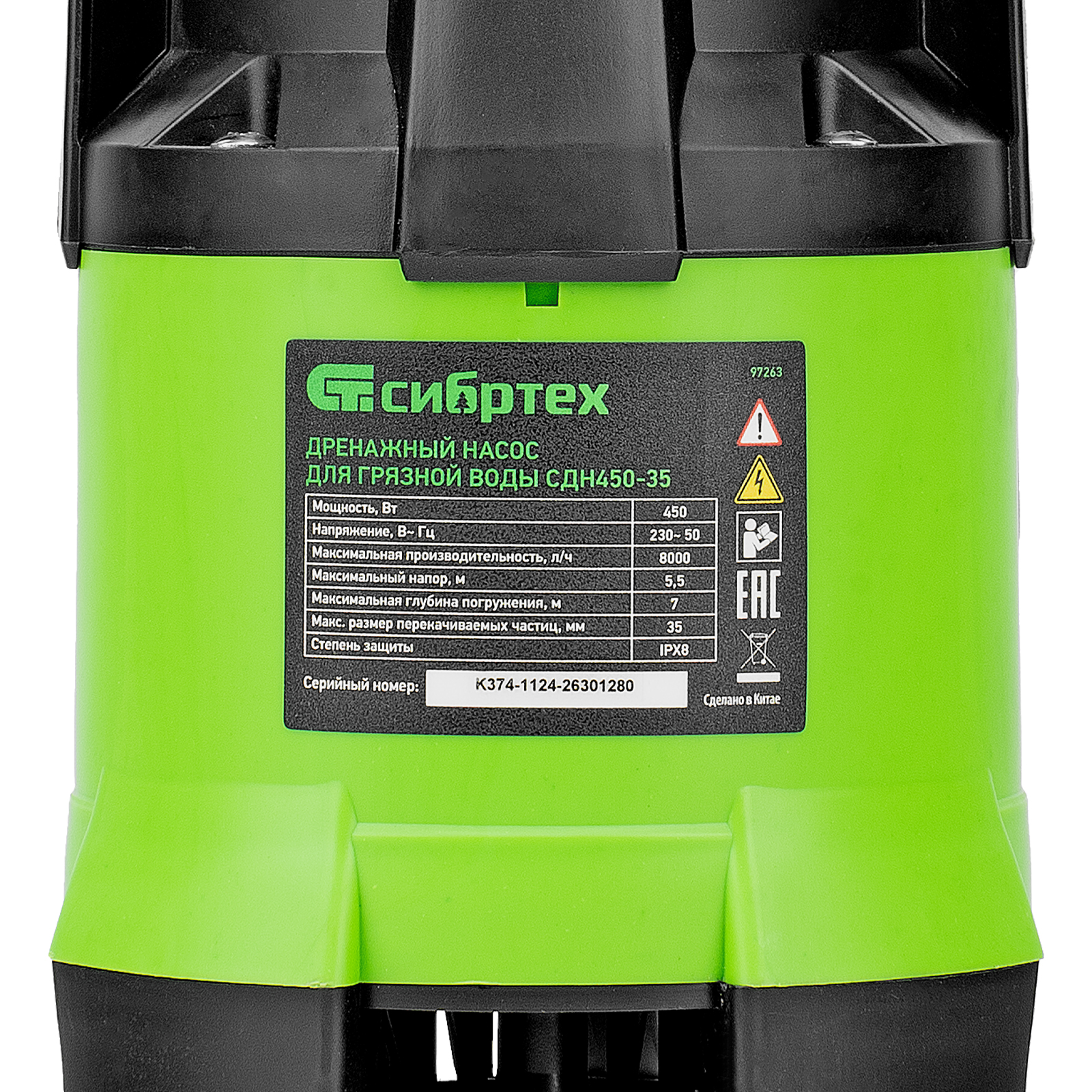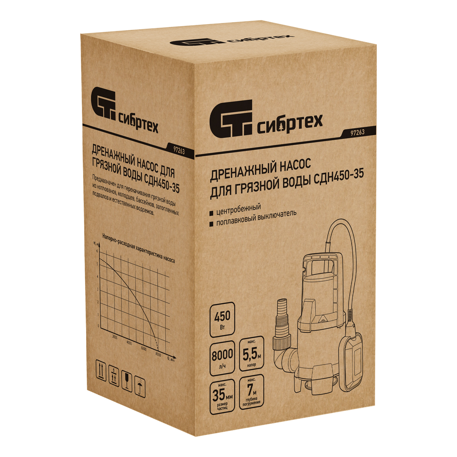 Дренажный насос для грязной воды СДН450-35, 450 Вт, напор 5.5 м, 8000 л/ч Сибртех