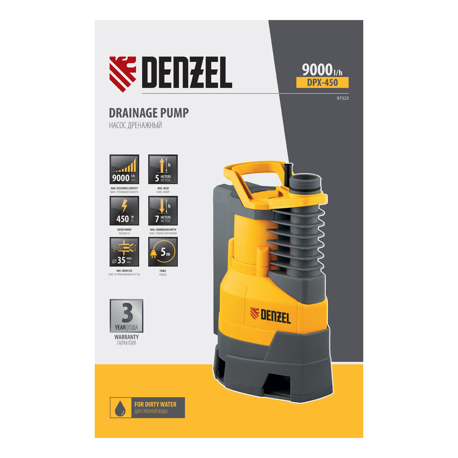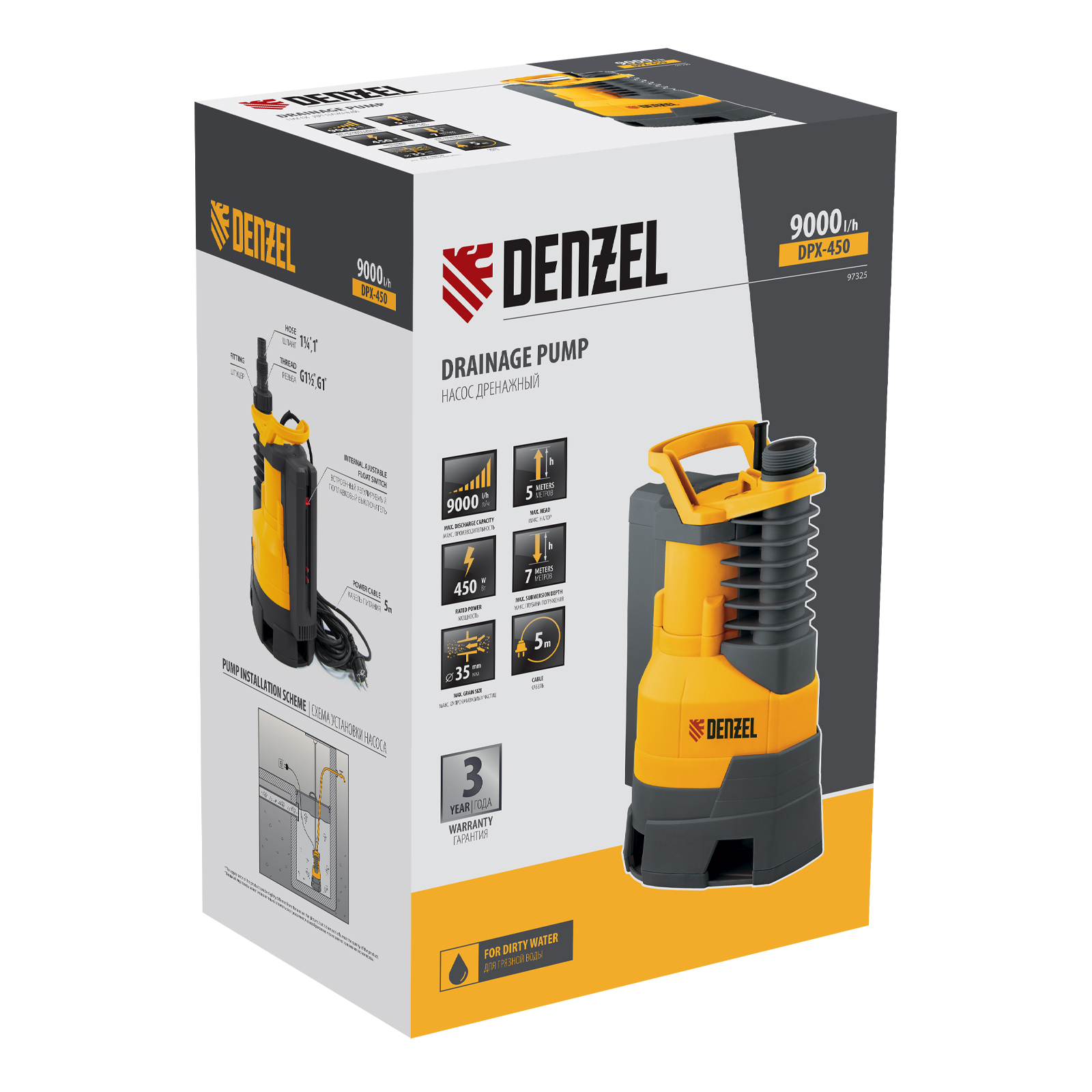 Дренажный насос DPХ450, 450 Вт, подъем 5 м, 9000 л/ч Denzel в Казани