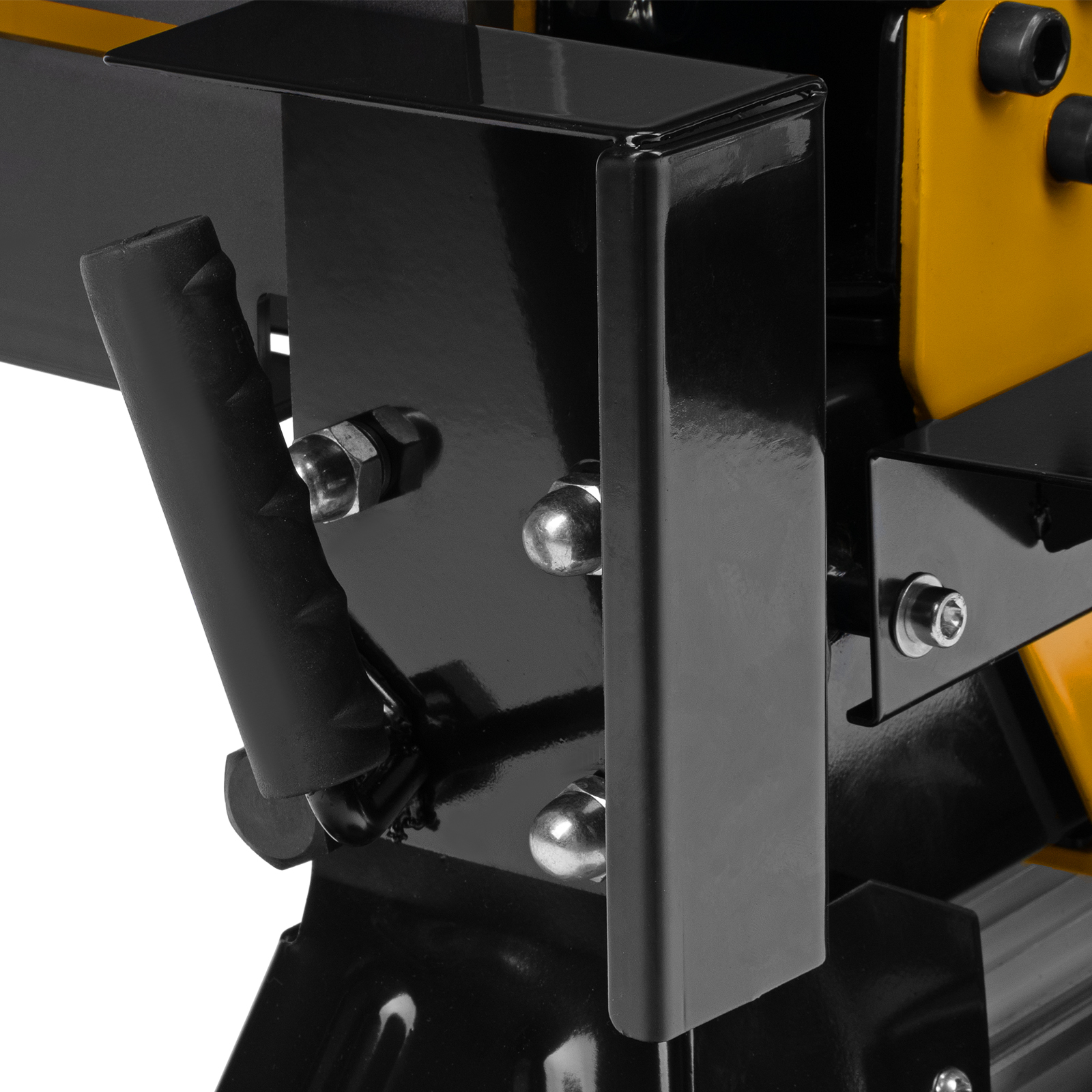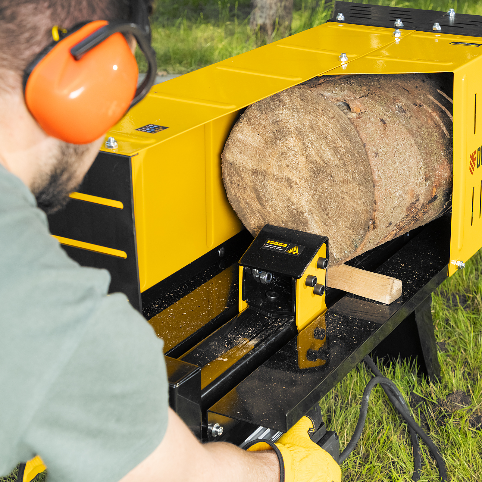 • Двухрычажная система блокировки — для раскалывания дров нужно удерживать рычаг гидравлики и кнопку двумя руками, иначе устройство остановится — такое решение делает рабочий процесс нетравмоопасным.