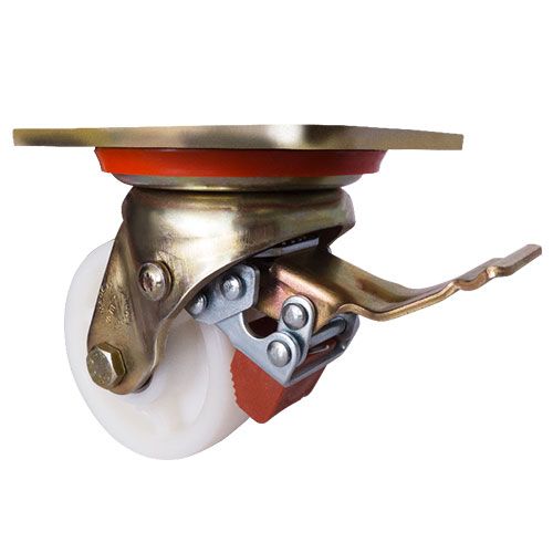 Данное большегрузное нейлоновое колесо предназначено для установки на передвижное оборудование, используемое в пищевой, химической и фармацевтической промышленности. Оно не боится воздействия влаги и различных химически агрессивных веществ, отличается низким коэффициентом трения и высокой износостойкостью. Шариковый подшипник в оси обеспечивает плавное вращение. Поворотный кронштейн изготовлен из оцинкованной стали, тип крепления — платформа с отверстиями под болты. Наличие тормозного механизма позволяет при необходимости надежно блокировать колесо, предотвращая его самопроизвольное перемещение. Максимальная грузоподъемность модели — 350 кг.