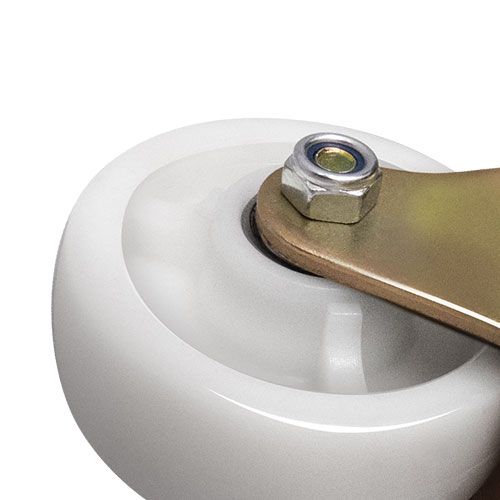 Данное большегрузное нейлоновое колесо предназначено для установки на передвижное оборудование, используемое в пищевой, химической и фармацевтической промышленности. Оно не боится воздействия влаги и различных химически агрессивных веществ, отличается низким коэффициентом трения и высокой износостойкостью. Шариковый подшипник в оси обеспечивает плавное вращение. Поворотный кронштейн изготовлен из оцинкованной стали, тип крепления — платформа с отверстиями под болты. Максимальная грузоподъемность модели — 400 кг.