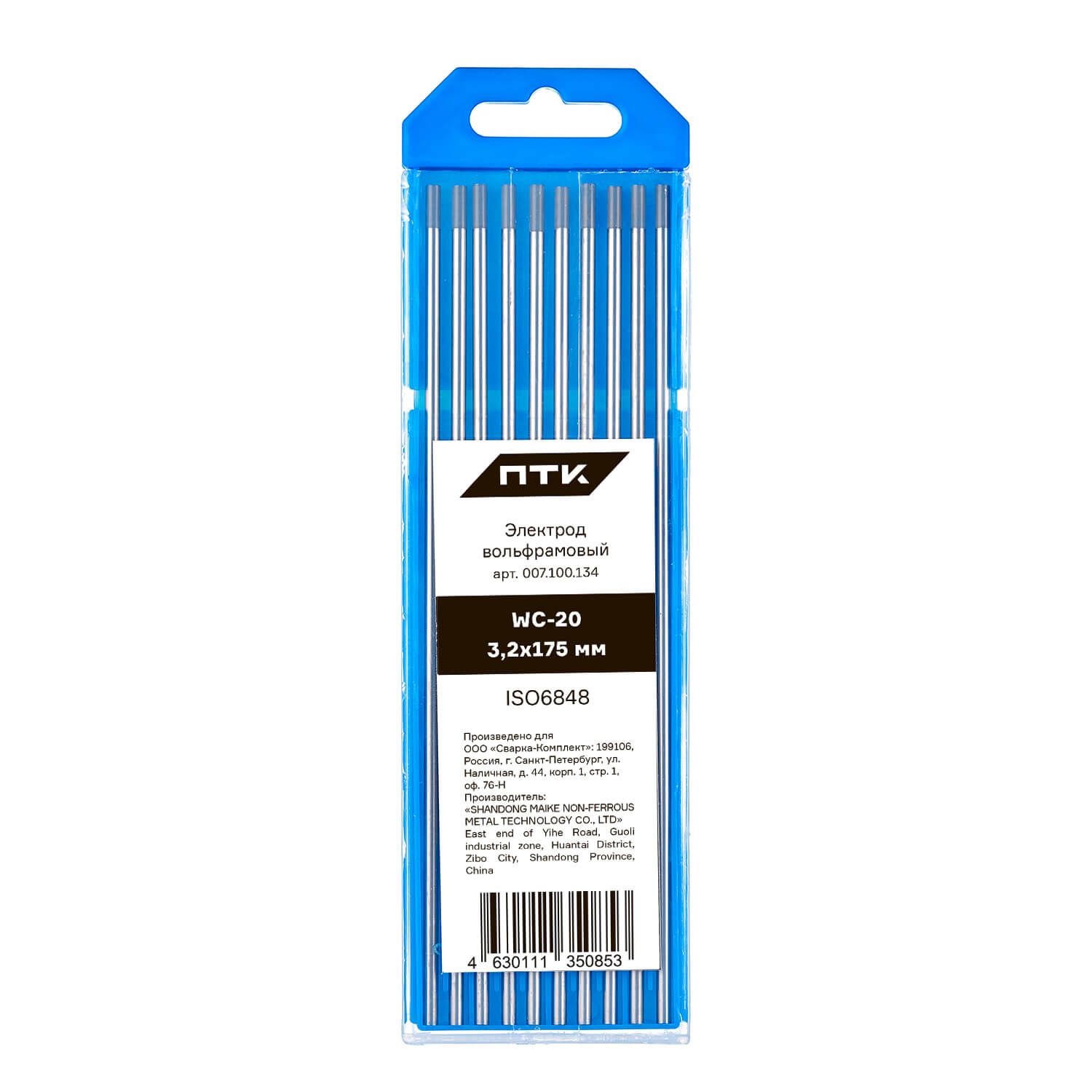 Диаметр электрода 3,2 мм, длина электрода 175 мм. Вольфрам имеет серый цвет торца. Поставляется в пластиковом пенале по 10 штук. В карточке с товаром указана цена за 1 вольфрамовый электрод.