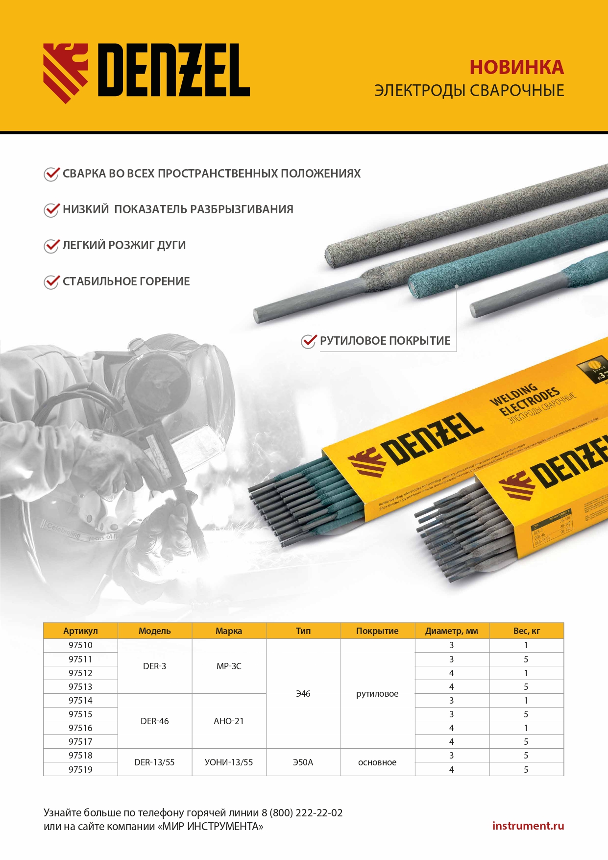 Электроды DER-3, диам. 3 мм, 1 кг, рутиловое покрытие Denzel в Казани