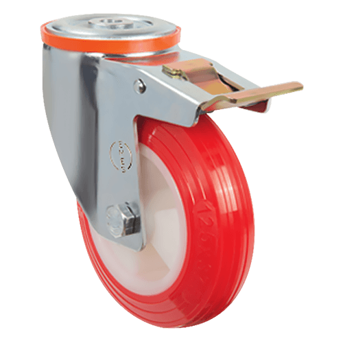 Опора колесная EMES EM04 ZKP 150F устанавливается на платформенные и покупательские тележки, стеллажи, евроконтейнеры, промышленное оборудование.