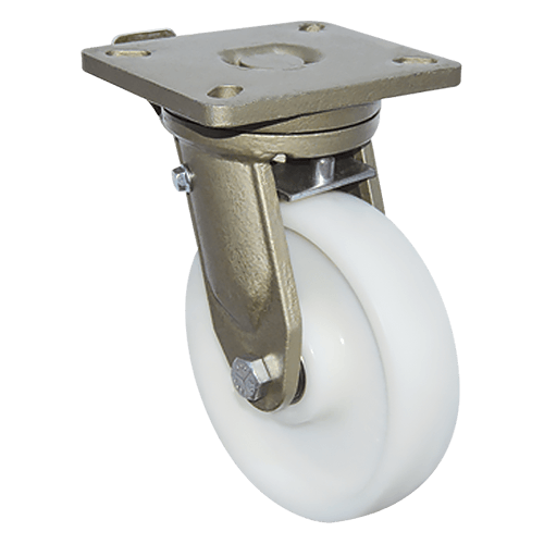 Данная большегрузная колесная опора выдерживает нагрузку до 750 кг. Кронштейн выполнен из прочной стали и имеет антикоррозионное покрытие, а само колесо — из цельнолитого нейлона, обладающего высокой устойчивостью к износу. Поворотный узел обеспечивает удобное изменение направления движения. Наличие тормозного механизма позволяет надежно фиксировать колесо в нужном положении во время остановки, предотвращая его самопроизвольное вращение и повышая безопасность при работе с грузами.