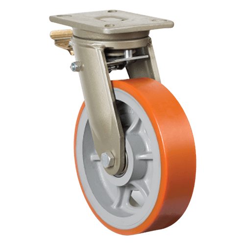 Поворотное большегрузное колесо EMES Большегрузное полиуретановое колесо EV 01 VBP 200F-60 диаметром 200 мм — оптимальный вариант для установки на большегрузное складское и строительное оборудование и платформенные тележки. Шинка изготовлена из полиуретана, обод — из высокопрочного чугуна, кронштейн — из оцинкованной стали, устойчивой от коррозии. Предусмотрено наличие тормоза-педали.