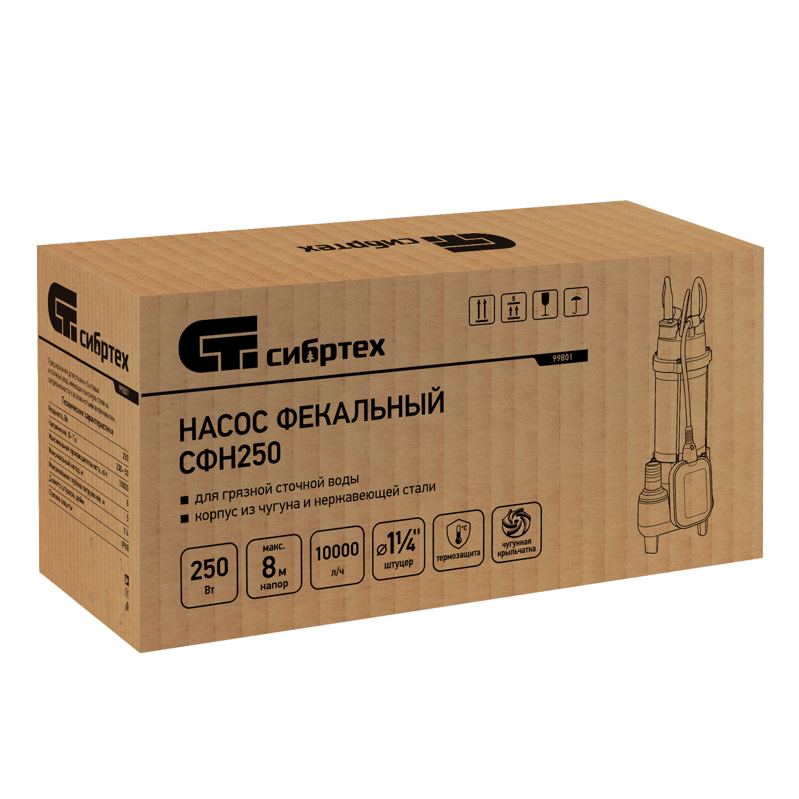 Фекальный насос Сибртех СФН250 99801 обеспечивает напор 8 м, имеет мощность 250 Вт и производительность до 10000 л/ч и применяется для откачки грязной воды из затопленных помещений, нечистот из выгребных ям и канализации. Также его можно использовать для организации принудительной канализационной системы или системы полива на даче. Диаметр штуцера для шланга составляет 1 1/4 дюйма. Насос подходит для работы с холодными стоками, при этом температура перекачиваемой жидкости не должна превышать 35 градусов. Благодаря чугунному импеллеру насос справляется с перекачкой воды, содержащей фракции диаметром до 15 мм.