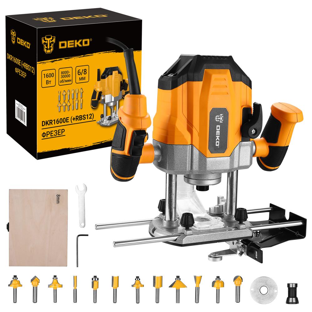 Фрезер DEKO DKR1600E применяется в различных столярных и плотницких работах для обработки кромок и профилей, фасок в деревянных конструкциях, для изготовления пазов и т.д. Рукоятки с нескользящими накладками способствуют надежному и комфортному хвату инструмента. Линейка, расположенная в боковой части корпуса, обеспечивает точную регулировку глубины фрезерования.  Характеристики:Напряжение: 220 ВМощность: 1600 ВтЧисло оборотов: 8000-30000 об/минРабочий ход: 56 ммДиаметр патрона:  6, 8 ммНабор фрез 12 предметов DEKO RBS12 – это универсальный набор для фигурного фрезерования дерева, в который входят:1. Пазовая галтельная фреза DIA-12.7, R-6.32. Пазовая конструкционная фреза «ласточкин хвост» DIA-12.7, ANGLE-143. Пазовая прямая фреза DIA-164. Пазовая прямая фреза DIA-125. Пазовая прямая фреза DIA-66. Пазовая V-образная фреза DIA-12.7, ANGLE-907. Кромочная калевочная фреза DIA-22, R-6.38. Кромочная калевочная фреза DIA-32, ANGLE 459. Кромочная прямая фреза DIA-12.710. Кромочная калевочная фреза DIA-22, R-6.311. Кромочная калевочная фреза DIA-28.6, R-9.512. Кромочная калевочная фреза DIA-25, R-413. Шестигранный ключ 2,5 ммКомплектация:Фрезер - 1 штПараллельный упор - 1 штНаправляющие штанги параллельного упора - 2 штКопировальная шайба - 1 штРоликовый упор - 1 штИгла - 1 штПылеотводящий патрубок - 1 штГаечный ключ - 1 штЦанга (6 и 8 мм) - 2 шт (одна установлена)Шкала - 1 штКрепежный комплект - 1 шт (винты - 4 шт, болты - 2 шт, гайки - 1 шт, барашковые гайки - 3 шт)Набор фрез RBS12 с шестигранным ключом - 1 штУгольные щетки - 2 штРуководство по эксплуатации - 1 шт