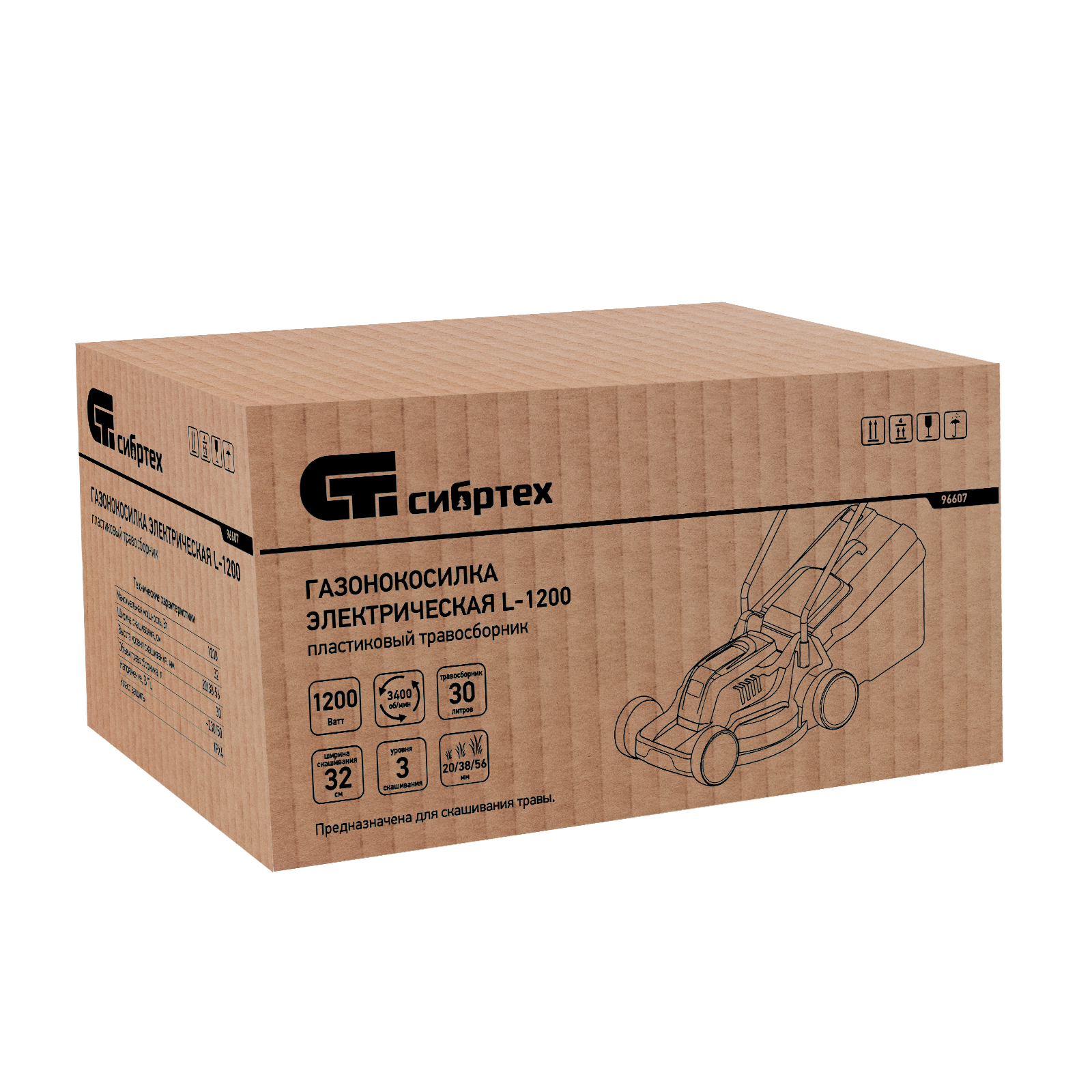 Газонокосилка электрическая L1200, 1200 Вт, ширина 32 см, 3 уровня, пластиковый травосборник 30 л. Сибртех