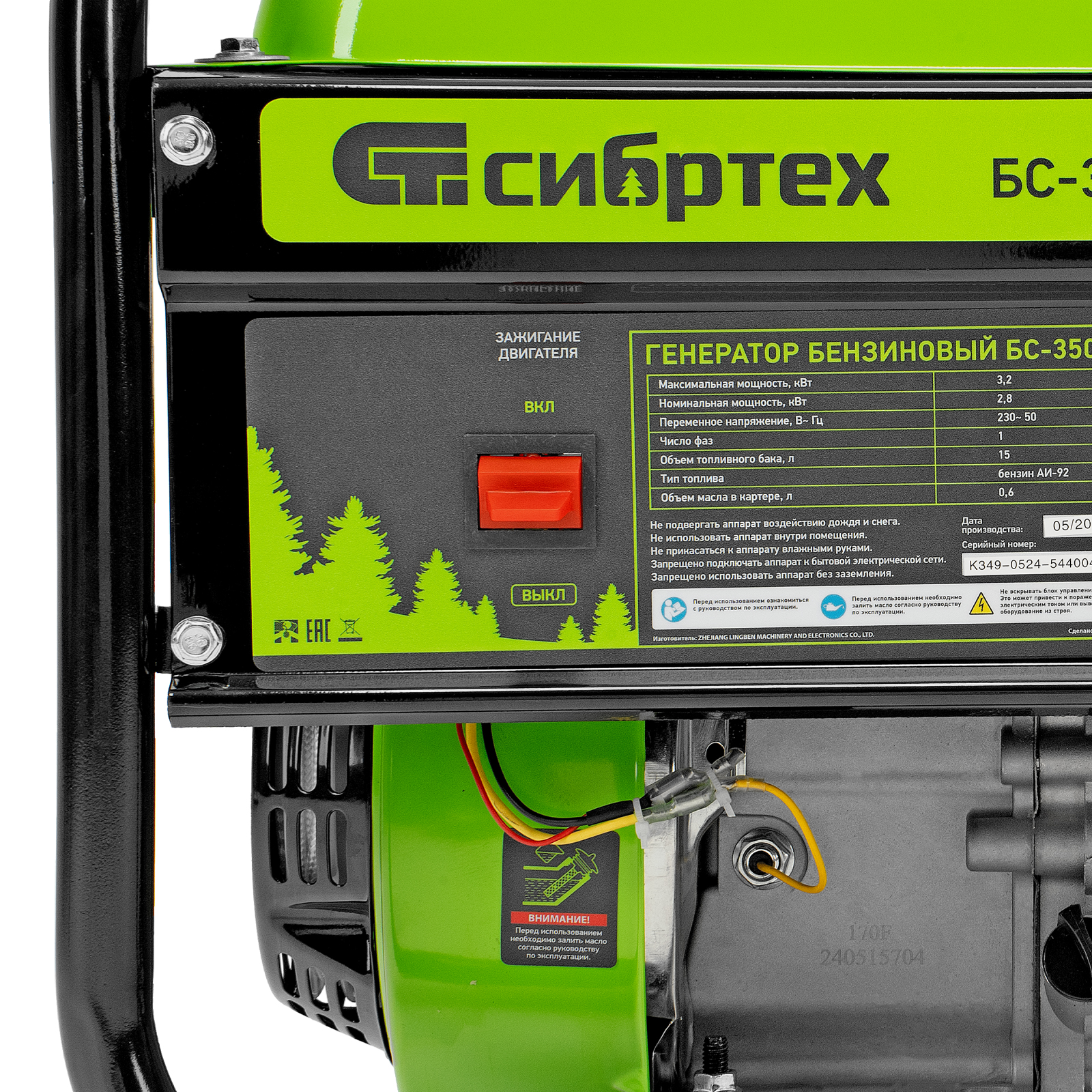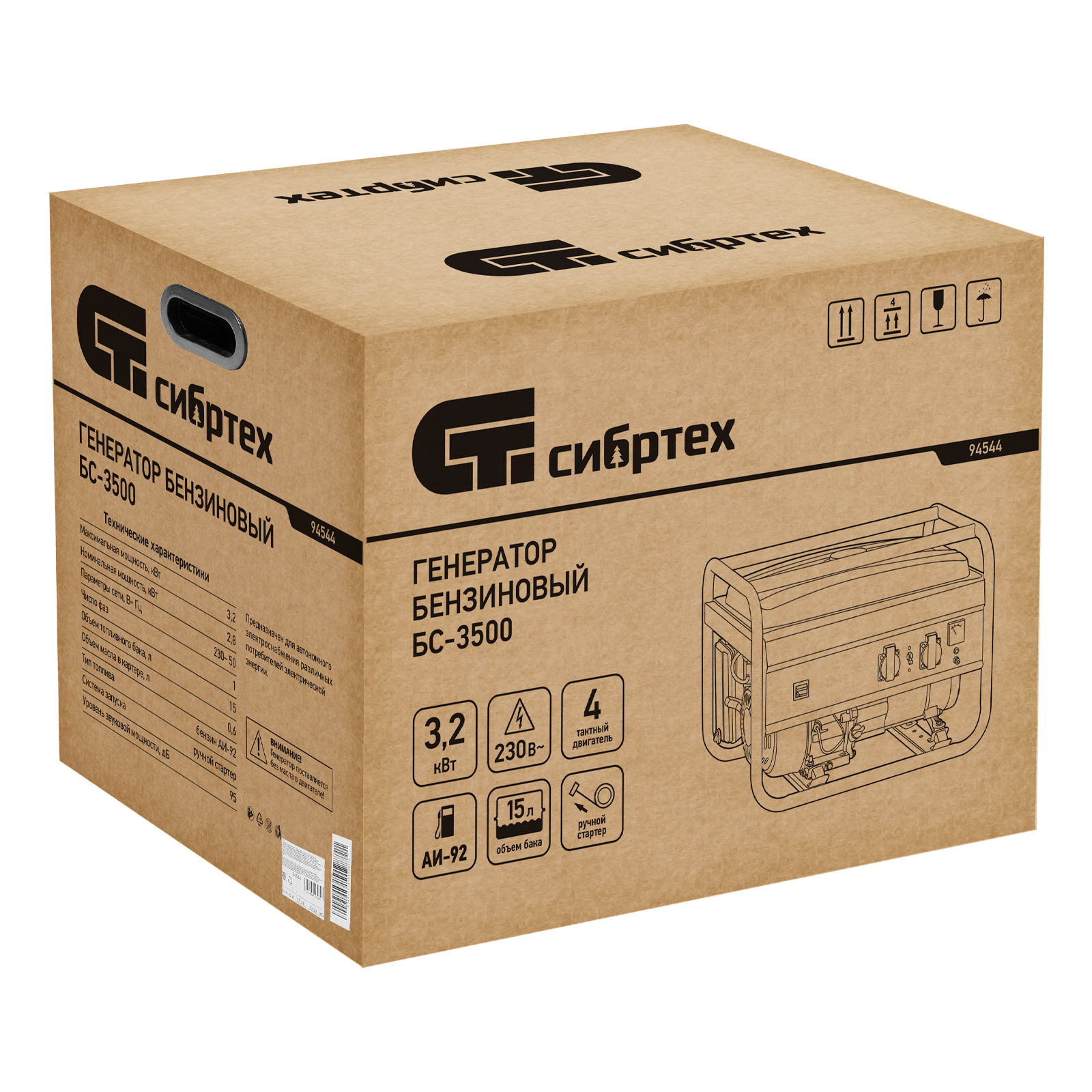 Генератор бензиновый БС-3500, 3.2 кВт, 230В, четырехтактный, 15 л, ручной стартер Сибртех