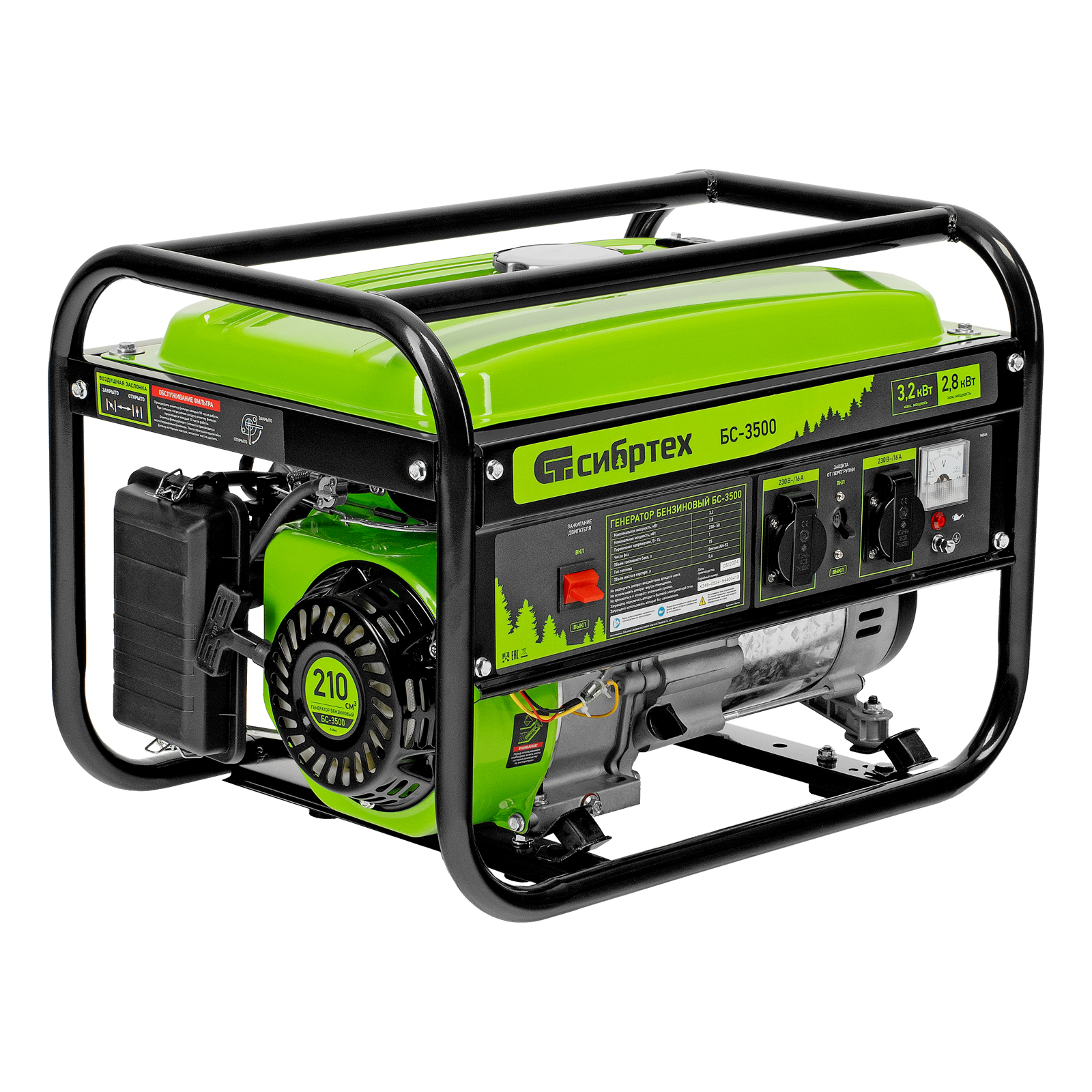 Бензиновый генератор Сибртех БС-3500 94544 на 230 В, максимальной мощностью 3,2 кВт, с 4-тактным двигателем, 15-литровым баком и ручным стартером, предназначен для электроснабжения дачи, кемпинга, небольшого магазина, гаража или строительной площадки. Весит всего 38,8 кг, что облегчает транспортировку, а значит, его можно брать на выездные работы или на природу. Выдаваемого напряжения 3,2 кВт хватает для одновременного подключения 4 ламп накаливания, холодильника, телевизора, электрочайника.