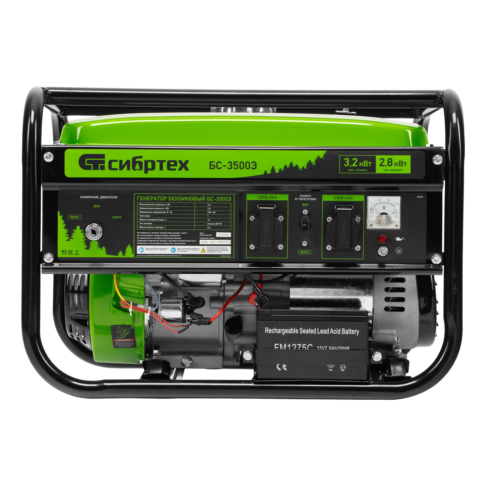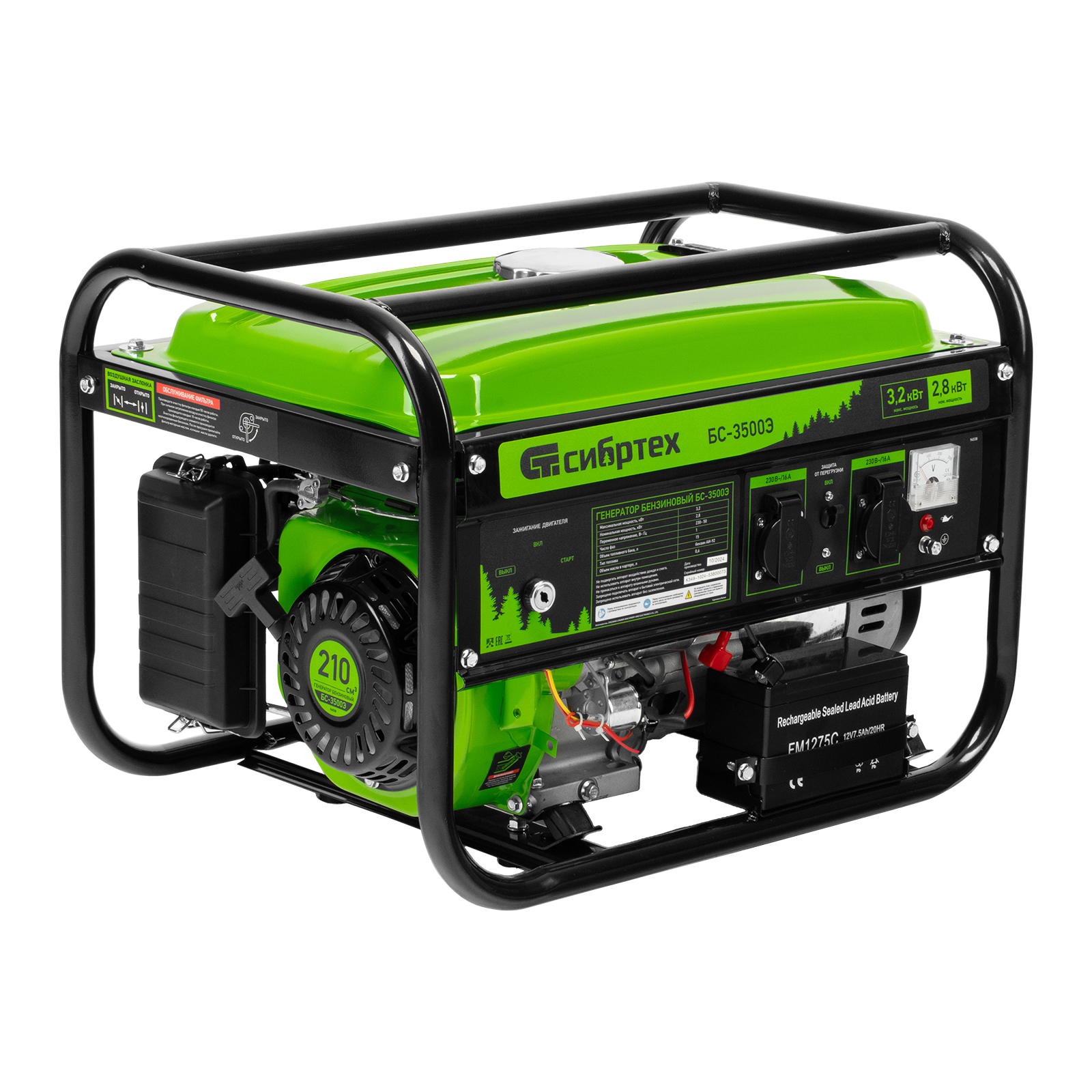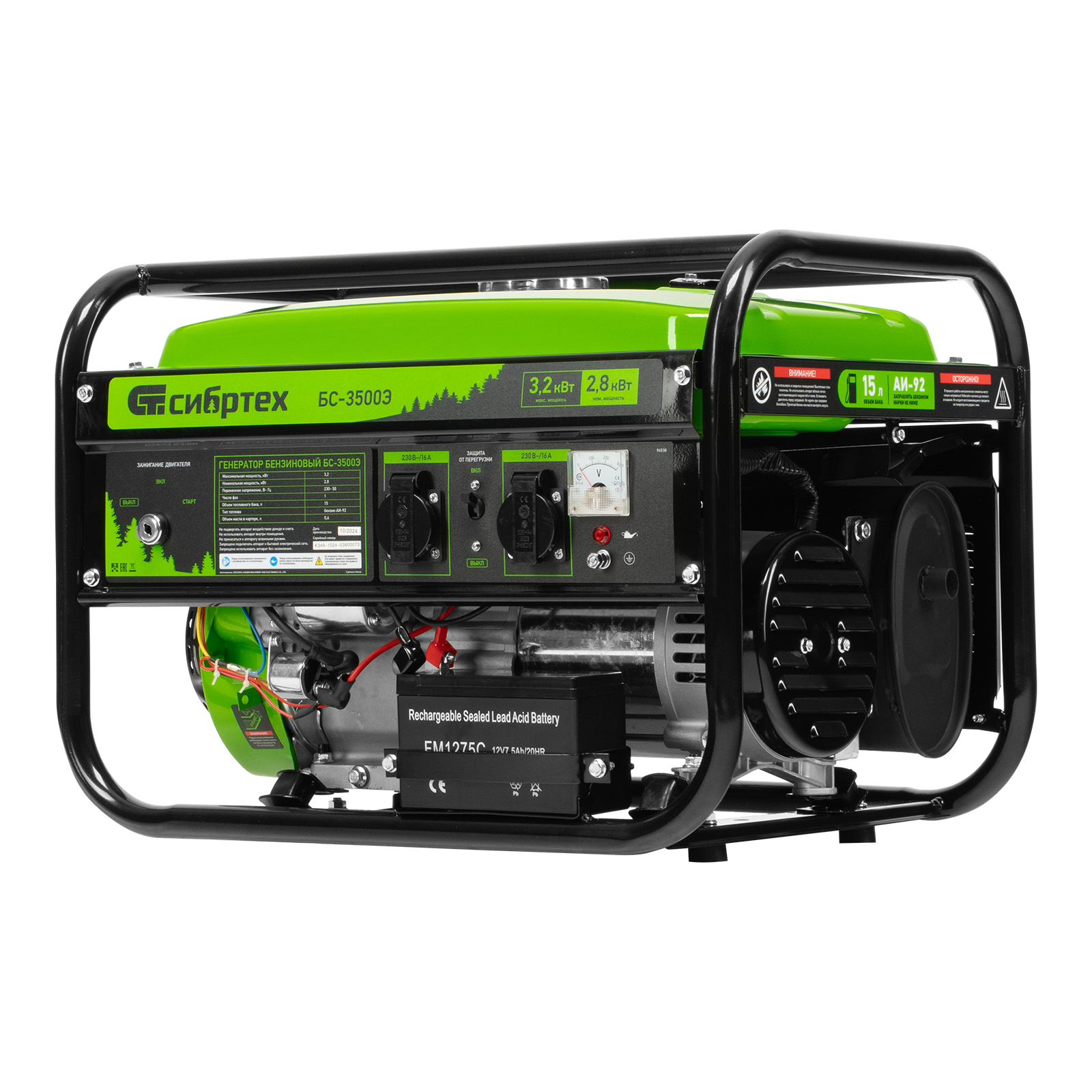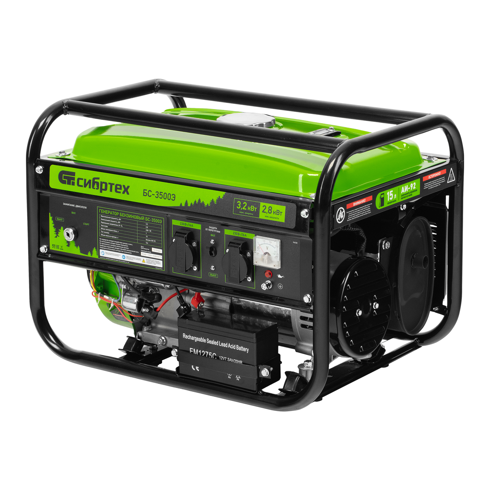 Бензиновый генератор Сибртех БС-3500Э 94538 выходной мощностью 3,2 кВт, с электростартером и баком объемом 15 л, поддерживает напряжение 230 В и предназначен для автономного электроснабжения в условиях отсутствия бытовой электросети. Для подключения потребителей предусмотрены 2 розетки 230 В/16 А. Автономный регулятор напряжения AVR позволяет подключать чувствительные приборы без риска их поломки. Генератор пригодится на дачном участке.