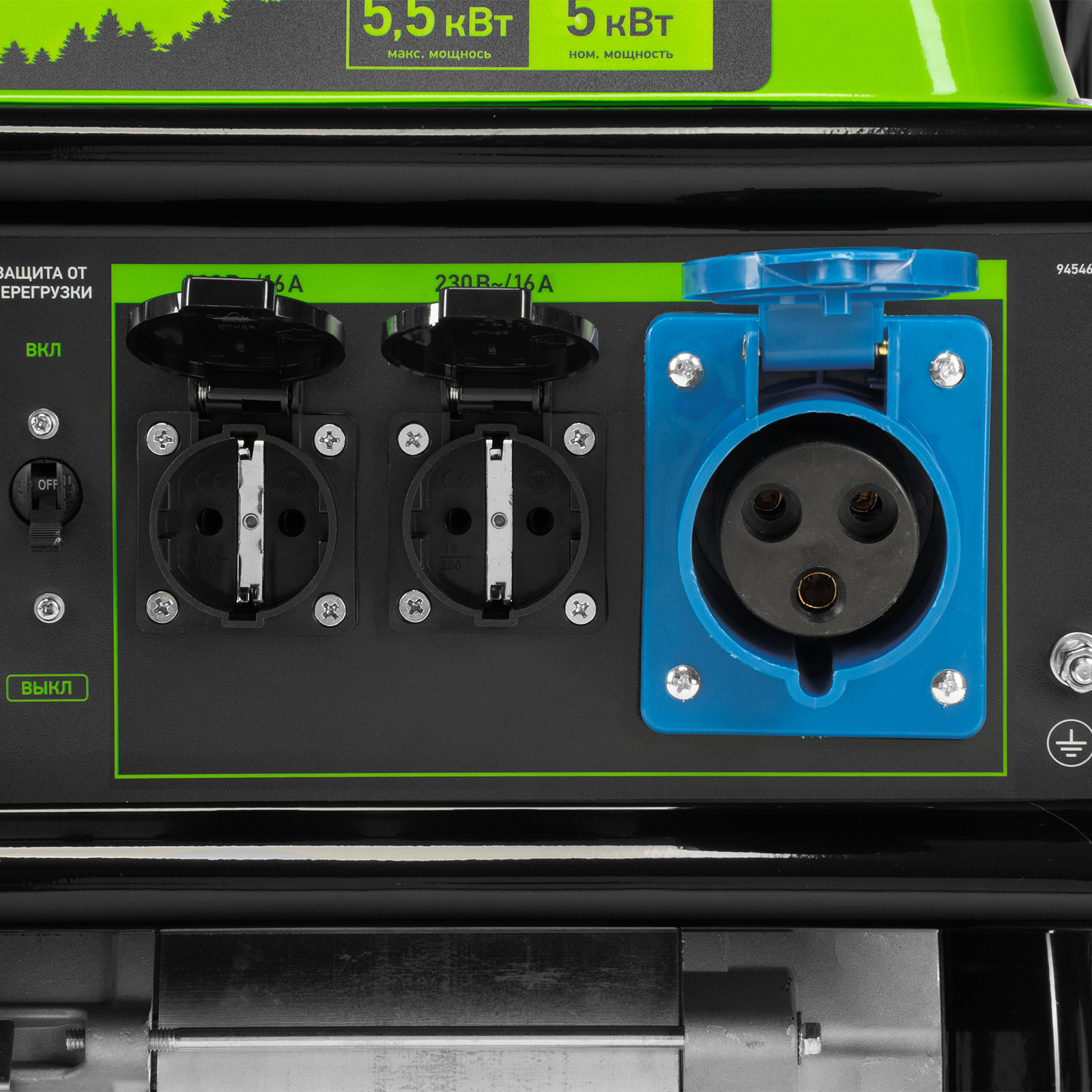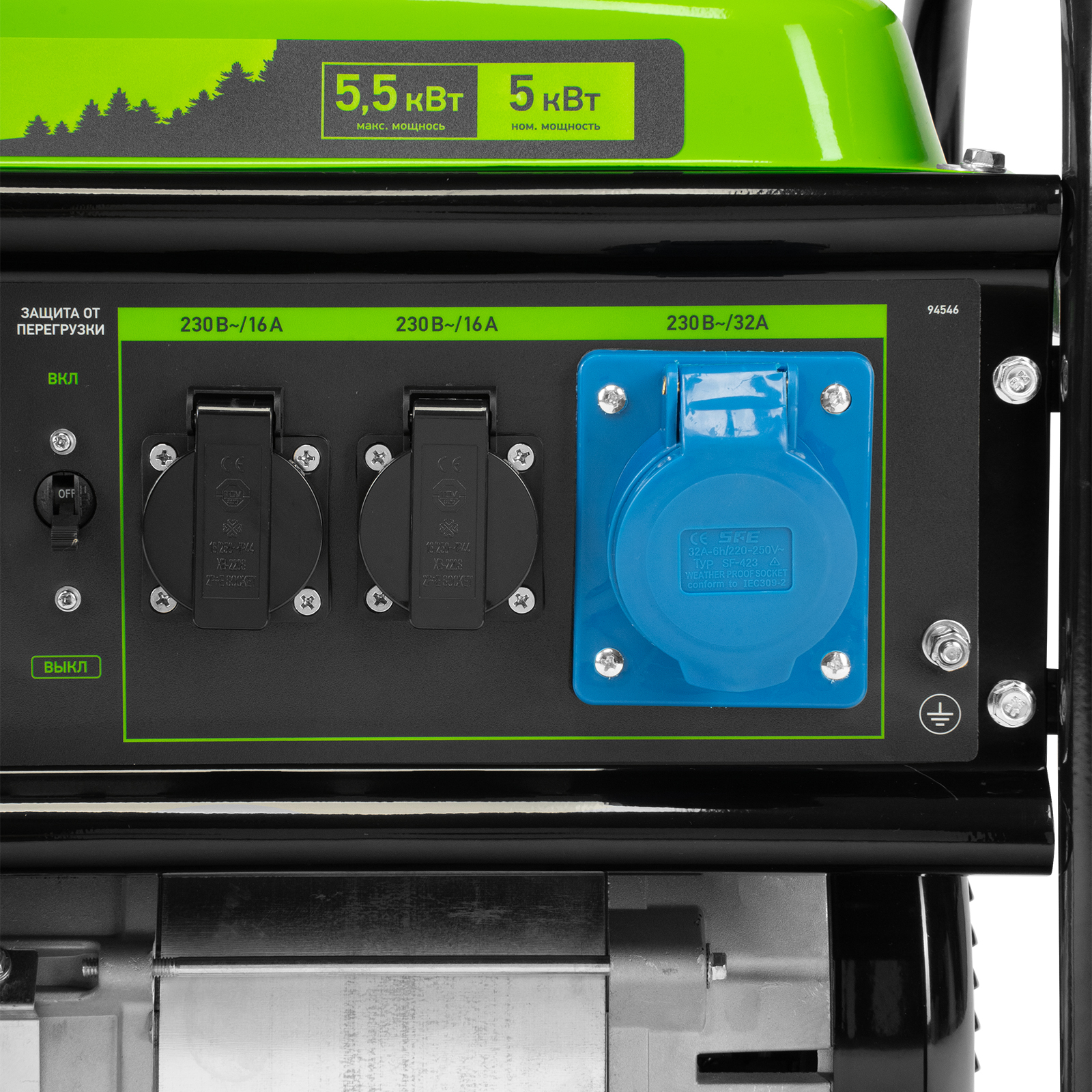 Бензиновый генератор Сибртех БС-6500 94546 на 230 В, с 4-тактным двигателем, баком на 25 л и ручным стартером, выдает 5,5 кВт и подходит для создания целой электросети в загородном доме, магазине, мастерской или на строительной площадке. К нему можно одновременно подключить 5 ламп накаливания, холодильник, телевизор. Для подключения приборов предусмотрено 3 розетки. Одна из них силовая на 32А, что позволяет запитать мощное оборудование, например, электрическую плиту.