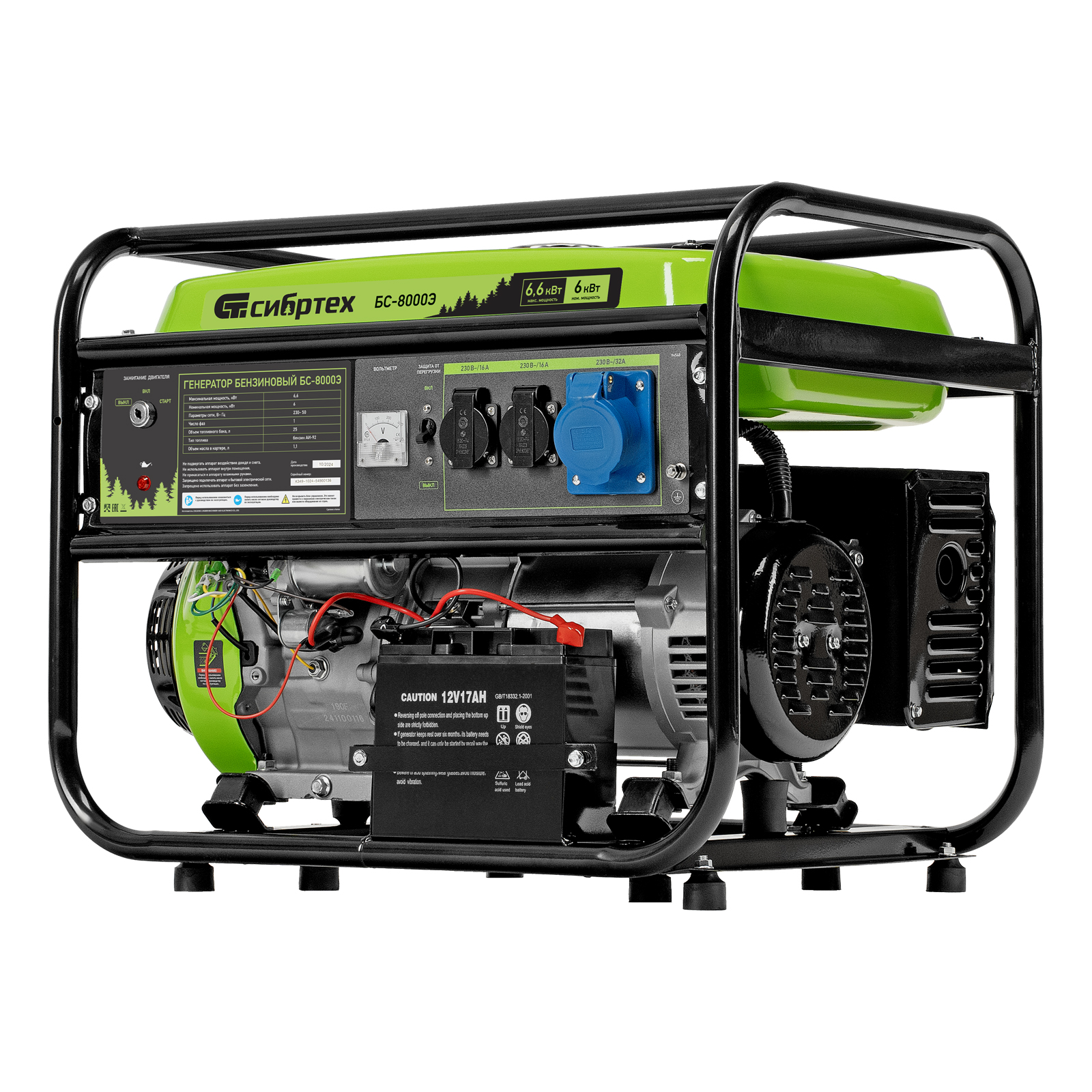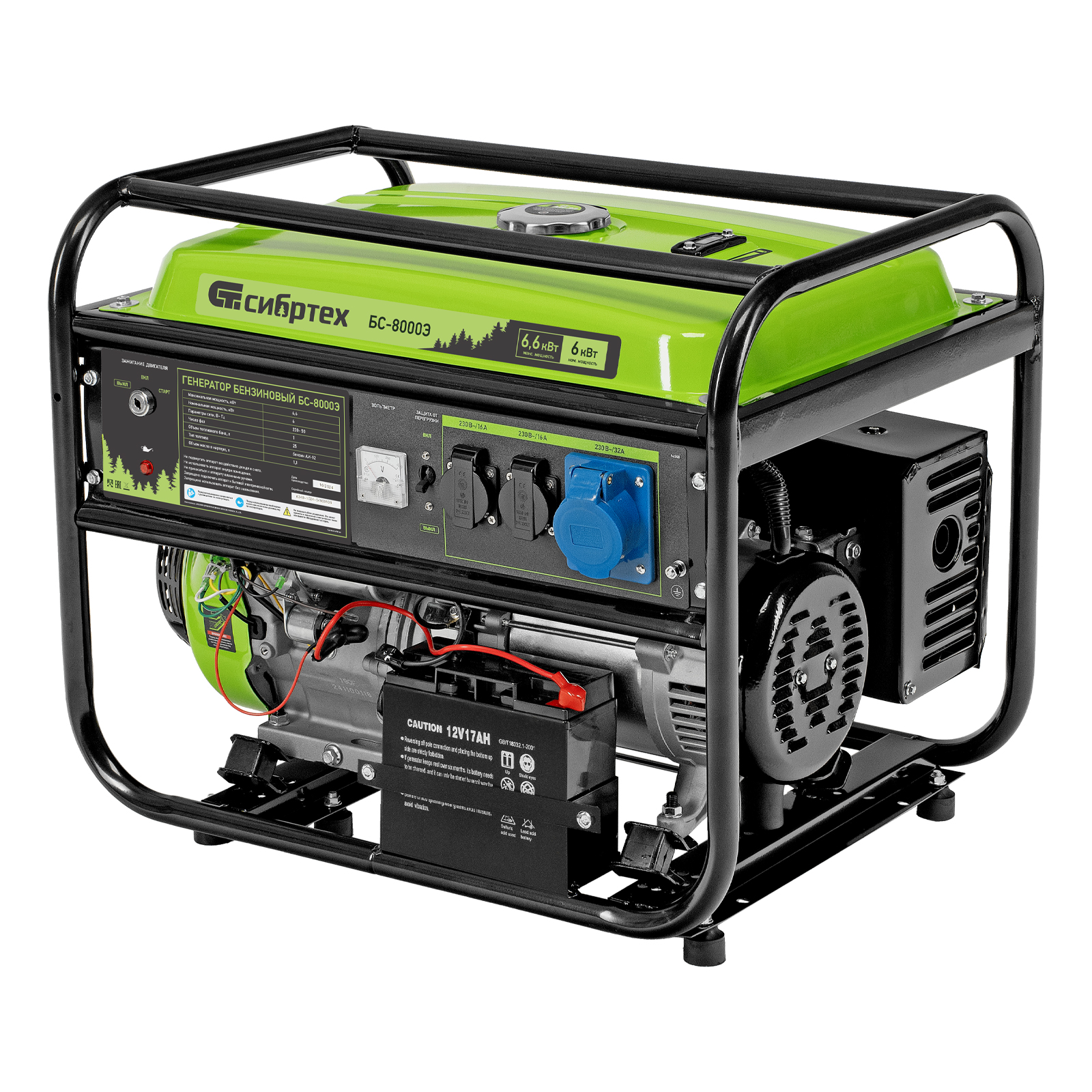 Бензиновый генератор Сибртех БС-8000Э 94549 мощностью 6,6 кВт, с 4-тактным двигателем, электростартером и баком объемом 25 л, выдает напряжение 230 В и является самым производительным в линейке. Подойдет для дачи, строительной площадки, мастерской, гаража или магазина. Благодаря мощности 6,6 кВт и наличию силовой розетки способен обеспечить бесперебойную работу нескольких потребителей одновременно, например, электрической плиты, холодильника, 5 ламп накаливания. Электростартер облегчает запуск — для начала работы достаточно просто повернуть ключ.