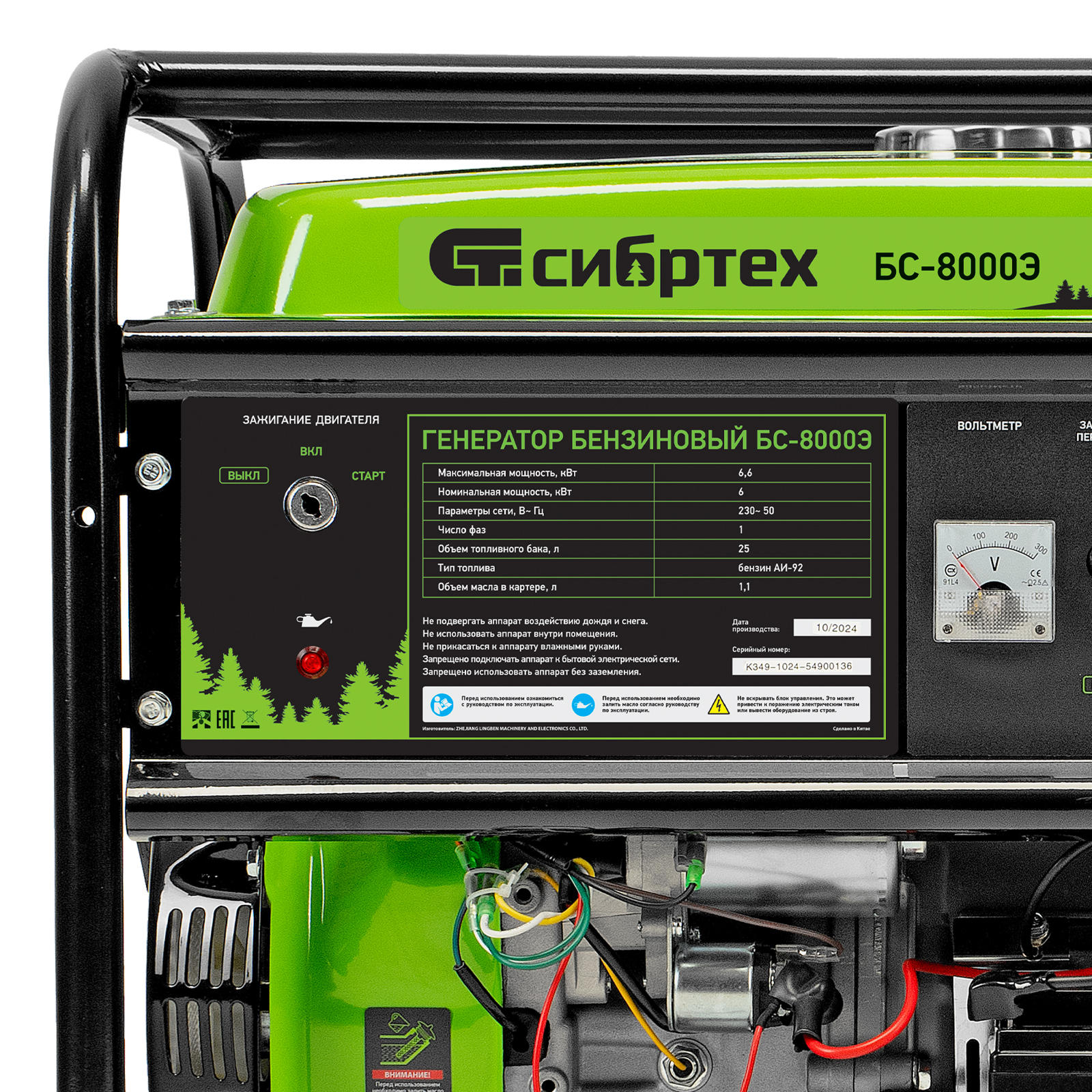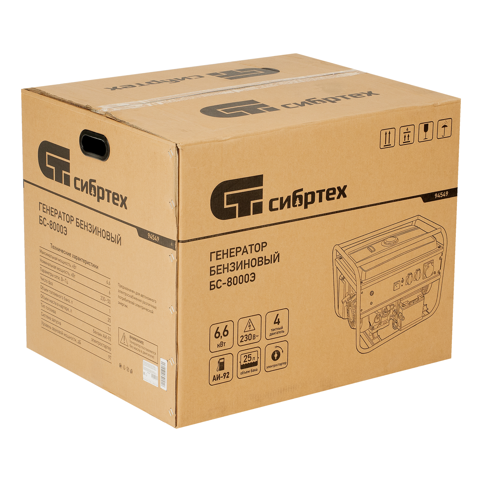 Генератор бензиновый БС-8000Э, 6,6 кВт, 230В, четырехтактный, 25 л, электростартер Сибртех в Казани