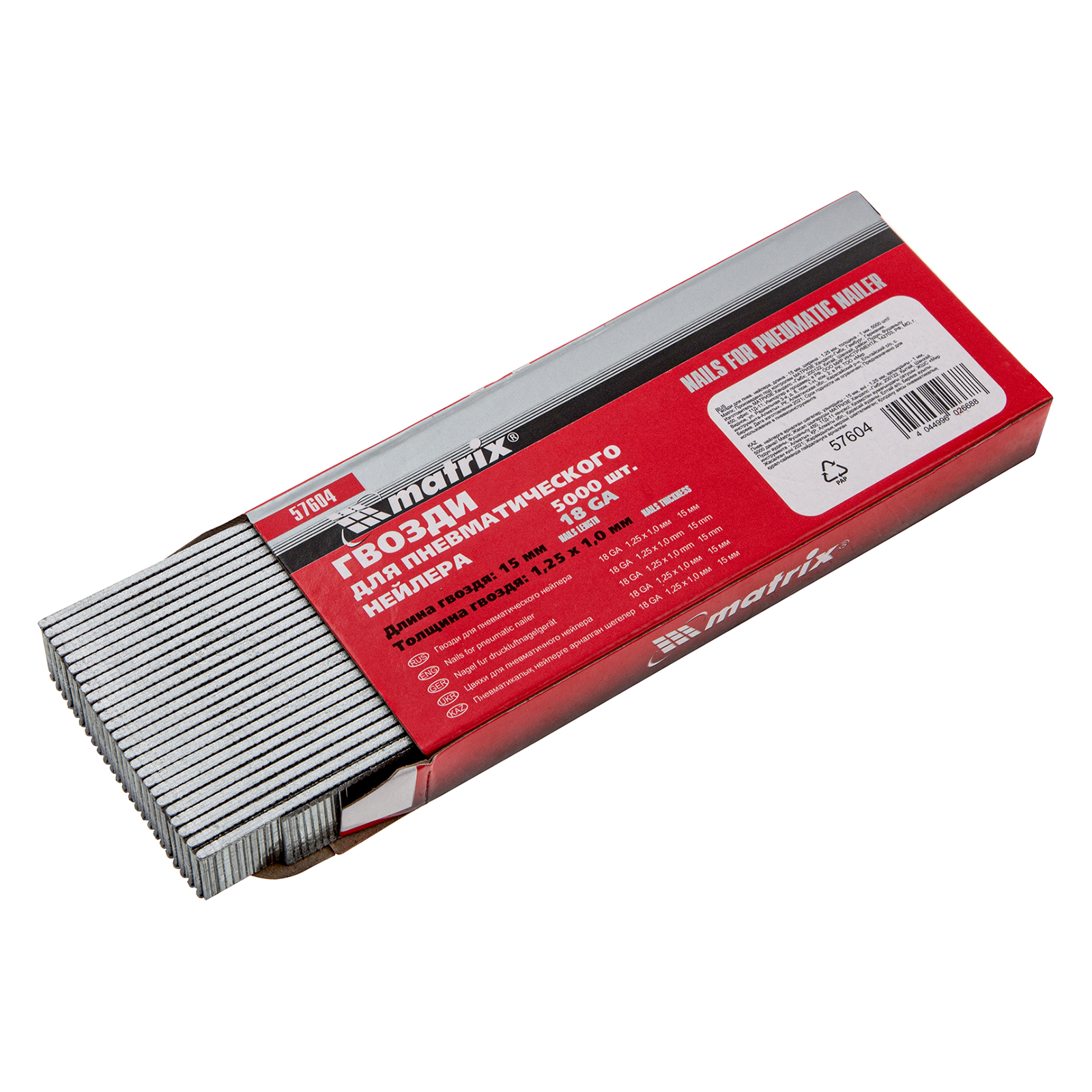 Гвозди Matrix 18GA 57604, 5000 шт. в упаковке, — крепежные элементы длиной 15 мм, шириной 1,25 и толщиной 1 мм, предназначенные для установки в пневматические нейлеры. С их помощью можно обить мебель, установить теплицу, закрепить плинтусы и настил.