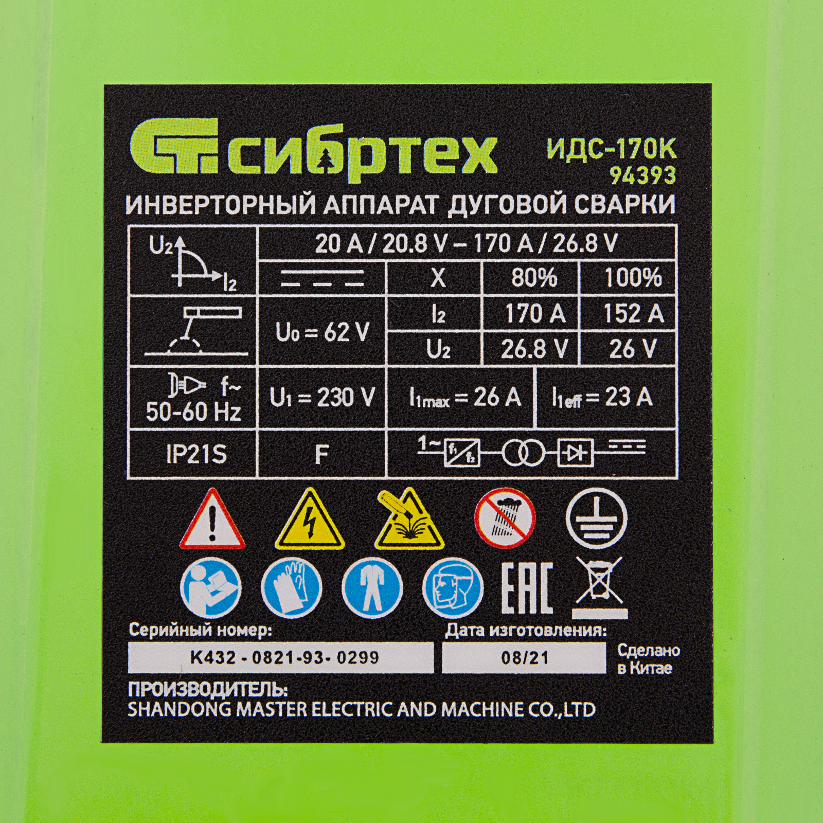 Инверторный аппарат дуговой сварки ИДС-170K, 170 А, ПВ 80%, диаметр электрода 1,6-3,2 мм Сибртех