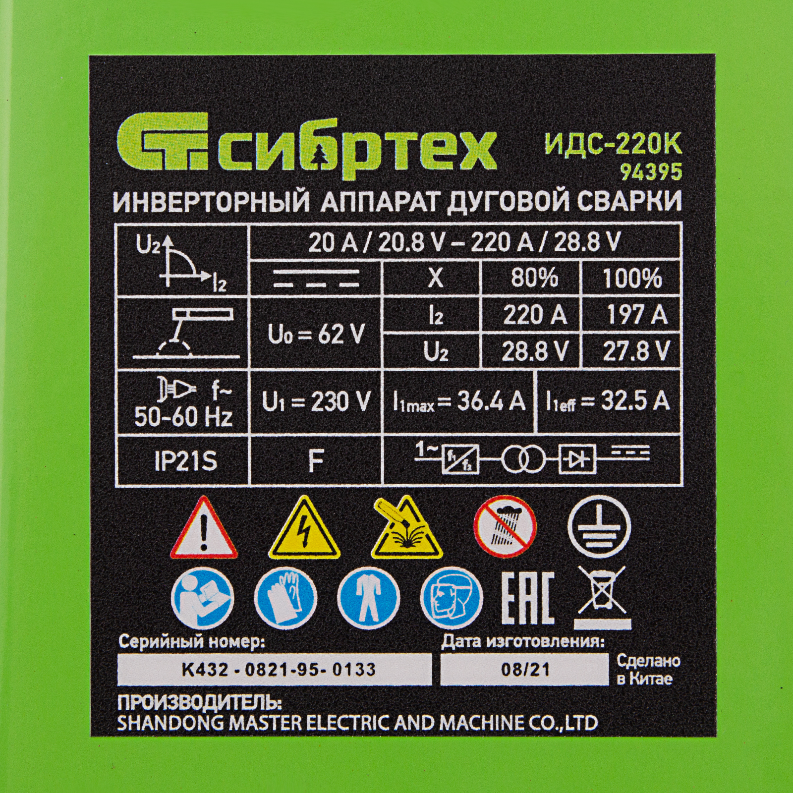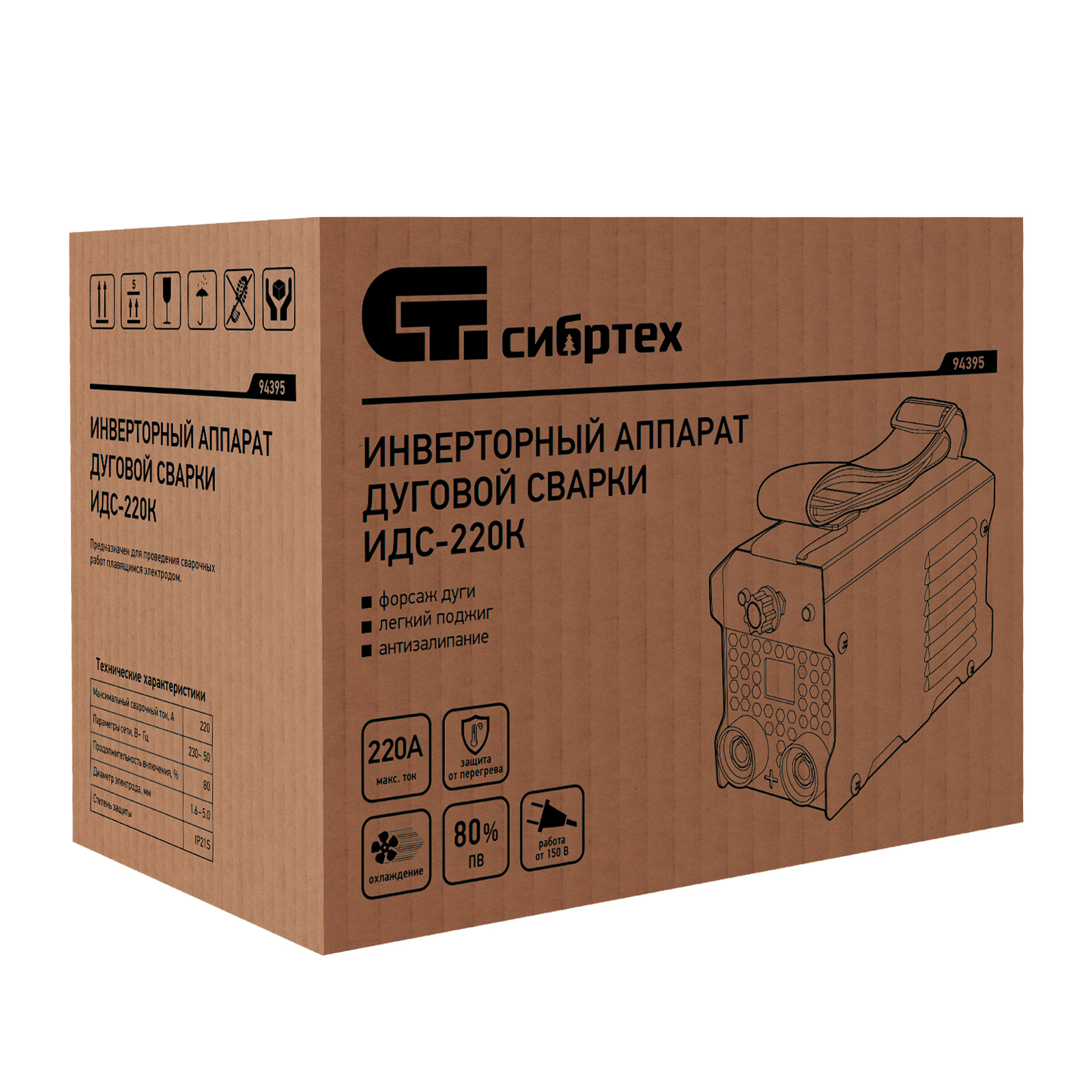 Инверторный аппарат дуговой сварки ИДС-220K, 220 А, ПВ 80%, диаметр электрода 1,6-5 мм Сибртех