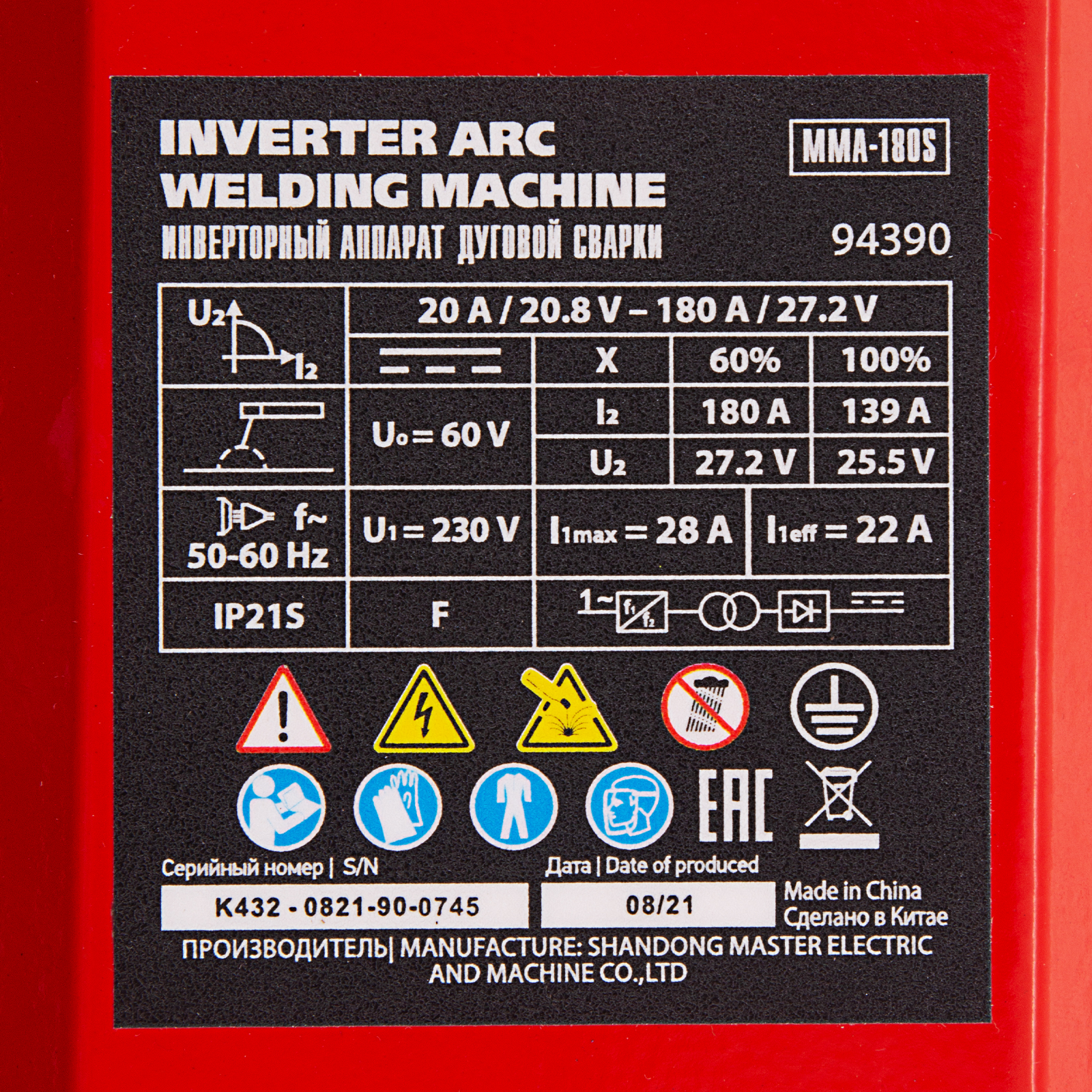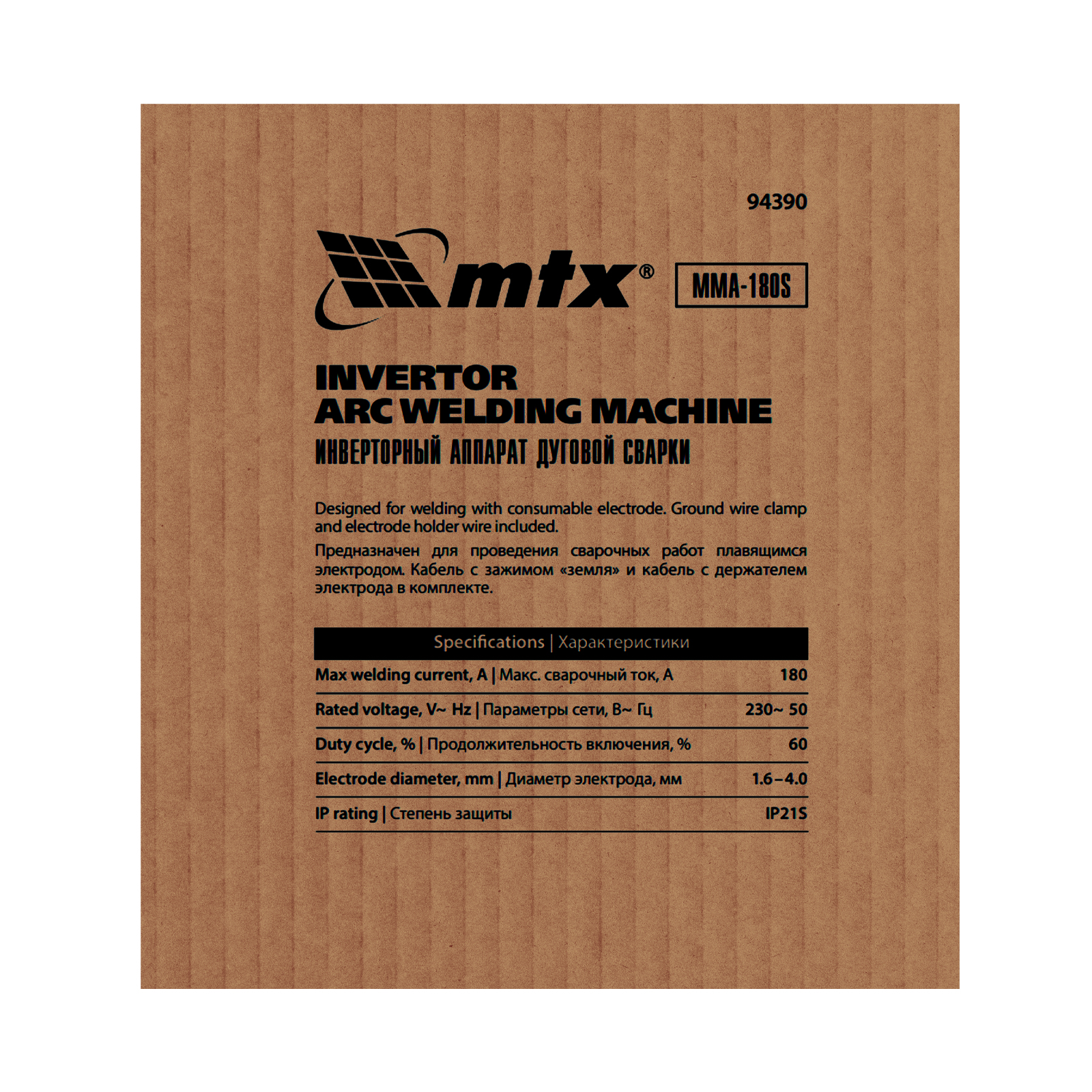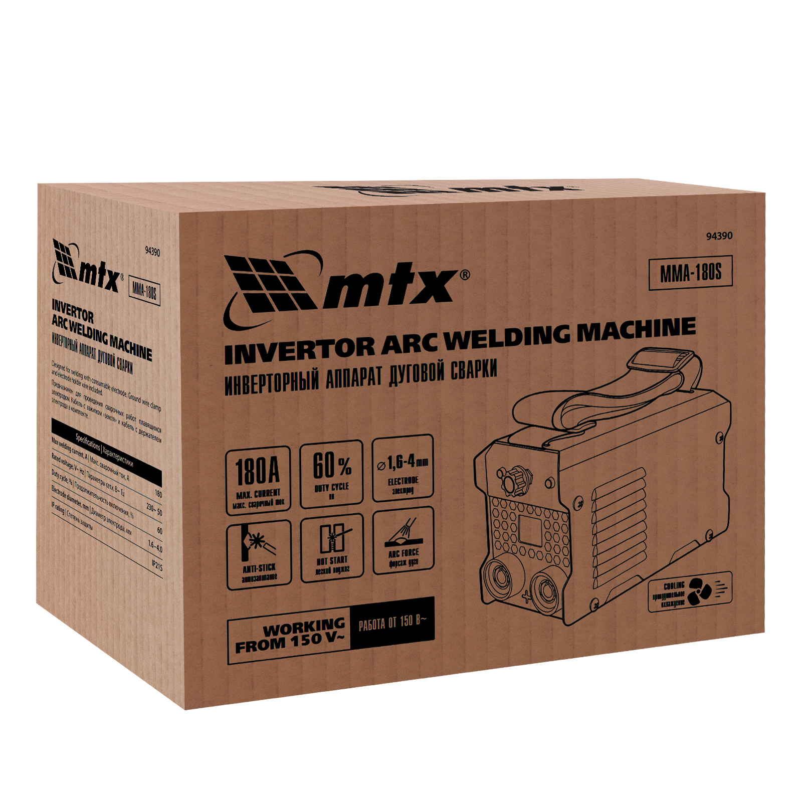 Инверторный аппарат дуговой сварки MMA-180S, 180 А, ПВ60%, диаметр электрода 1,6-4 мм MTX