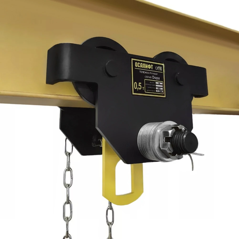 Устанавливается на двутавровую балку для подвеса тали за крюк и перемещения груза вдоль двутавра |