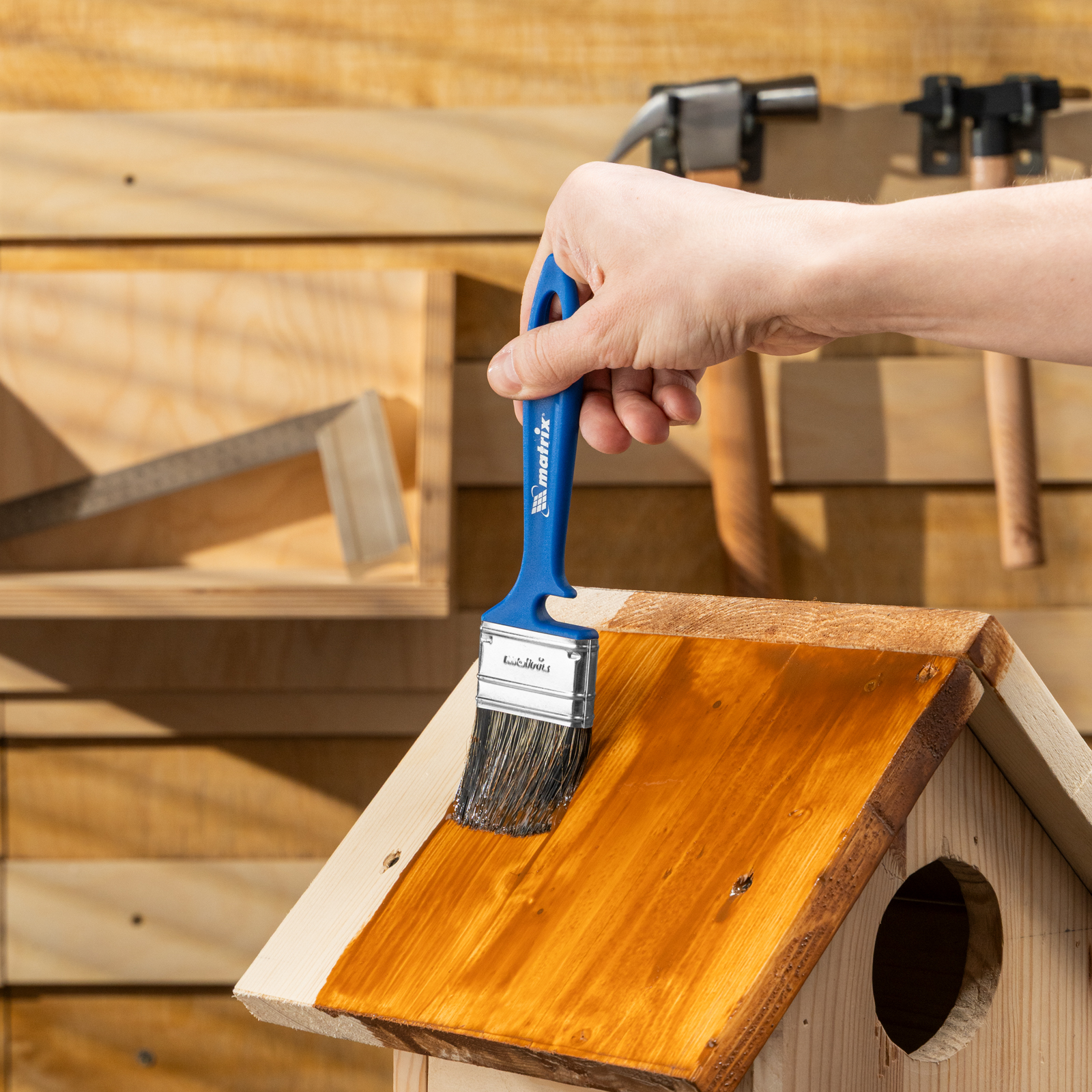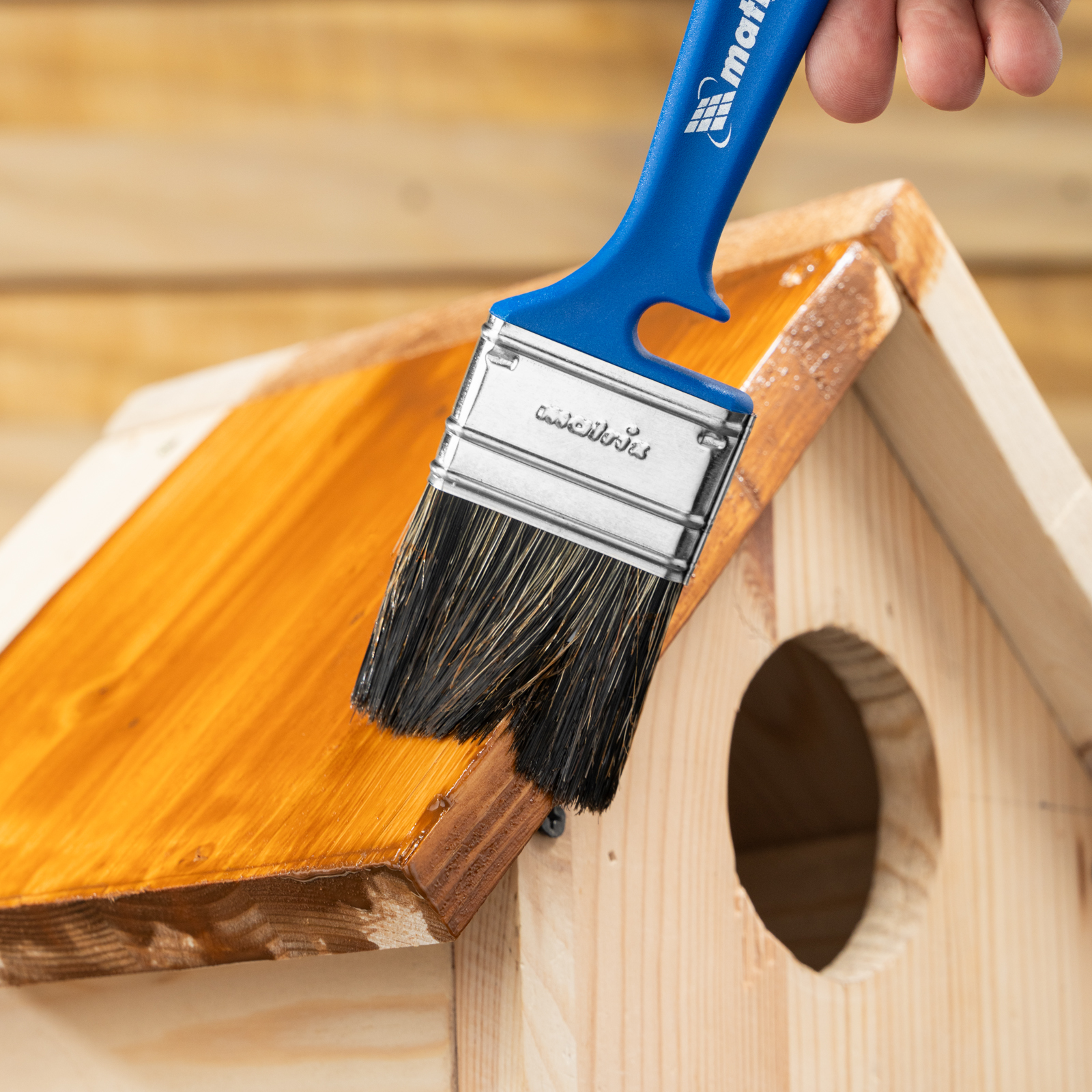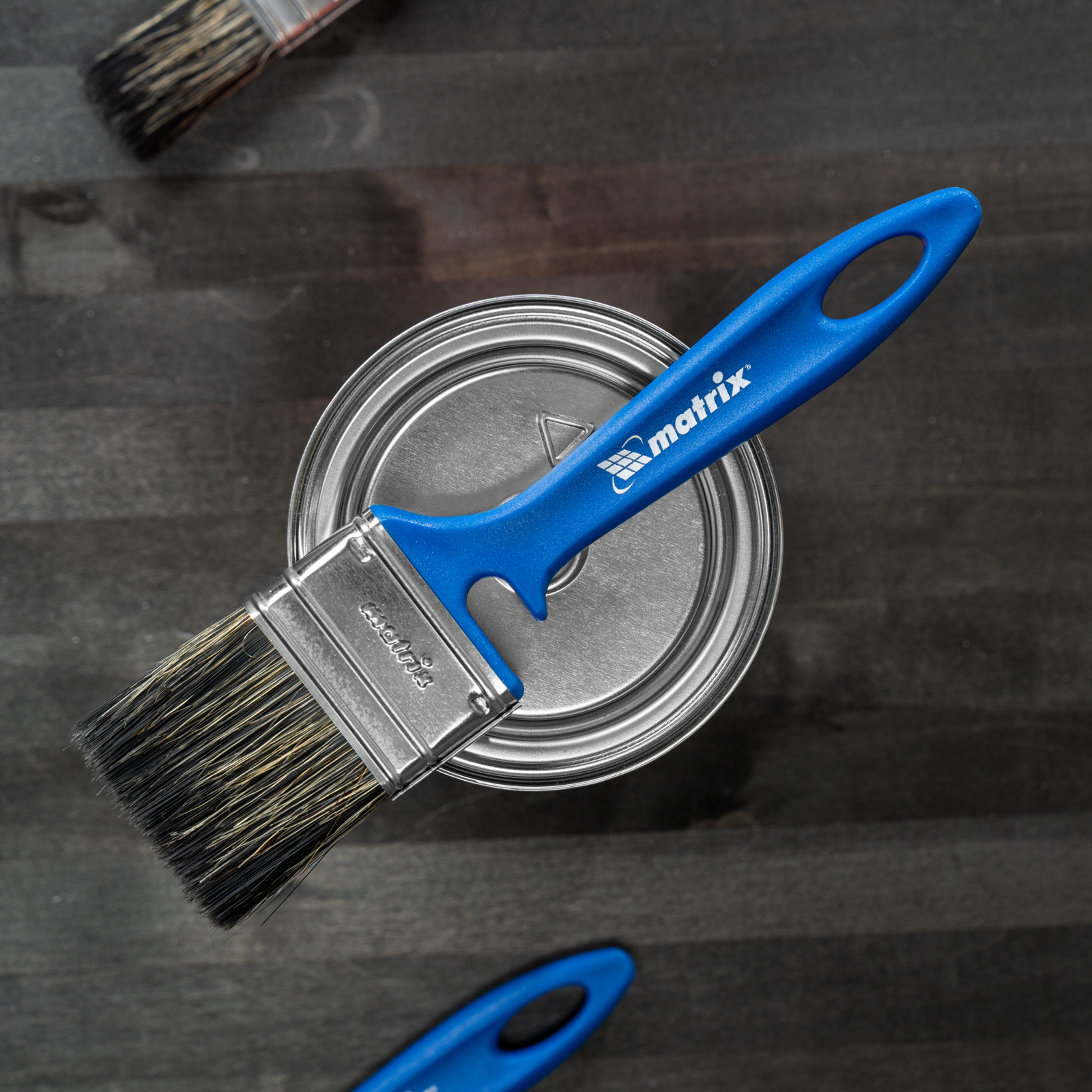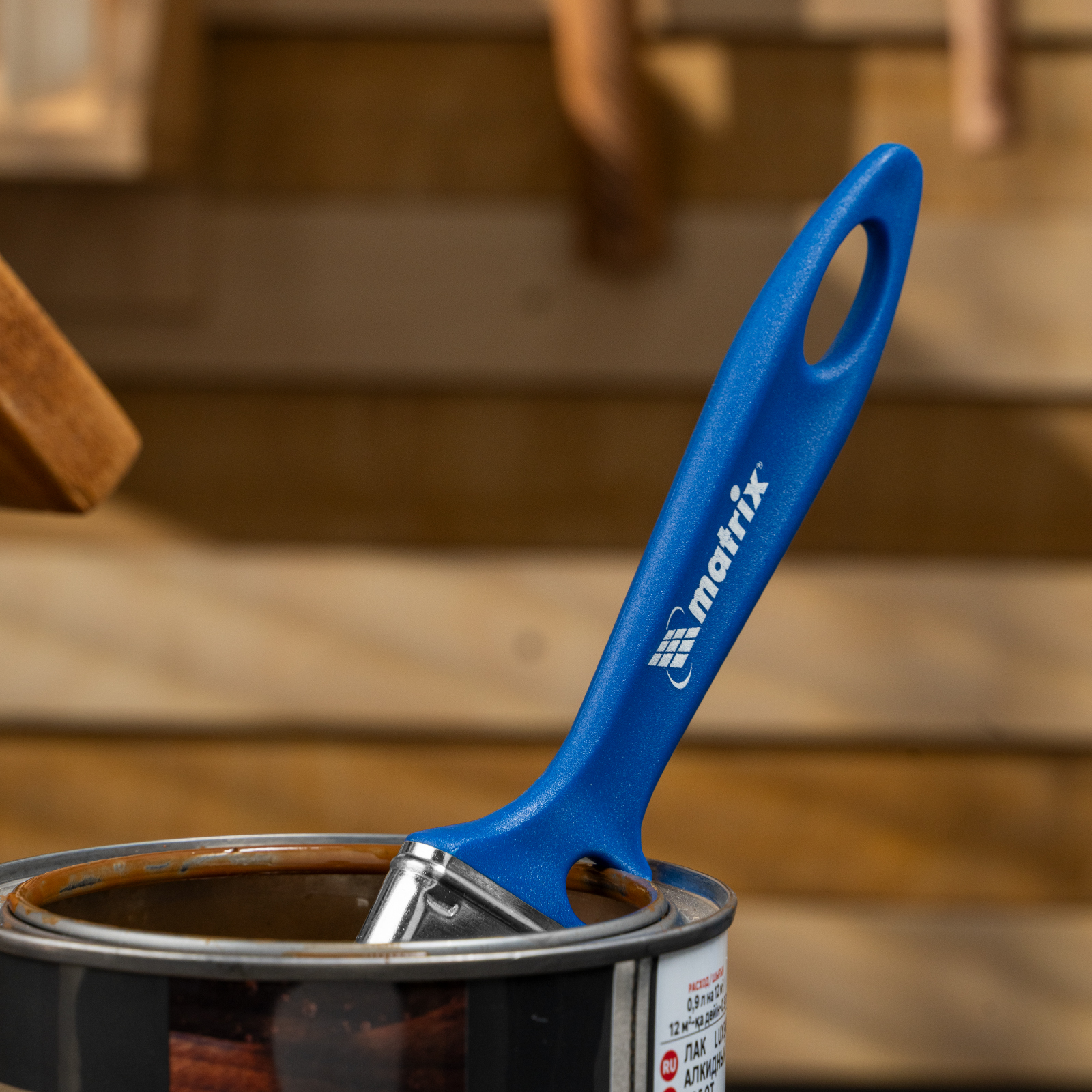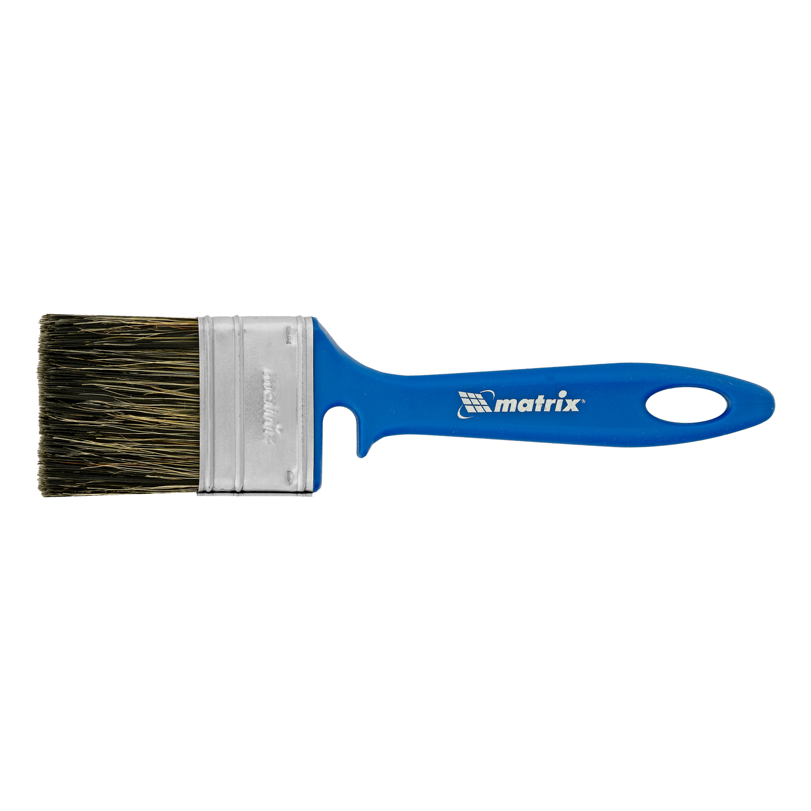 - Удобное хранение — специальная форма рукоятки позволяет закрепить инструмент на краю банки или ведра, а отверстие в верхней части служит для подвешивания кисти.