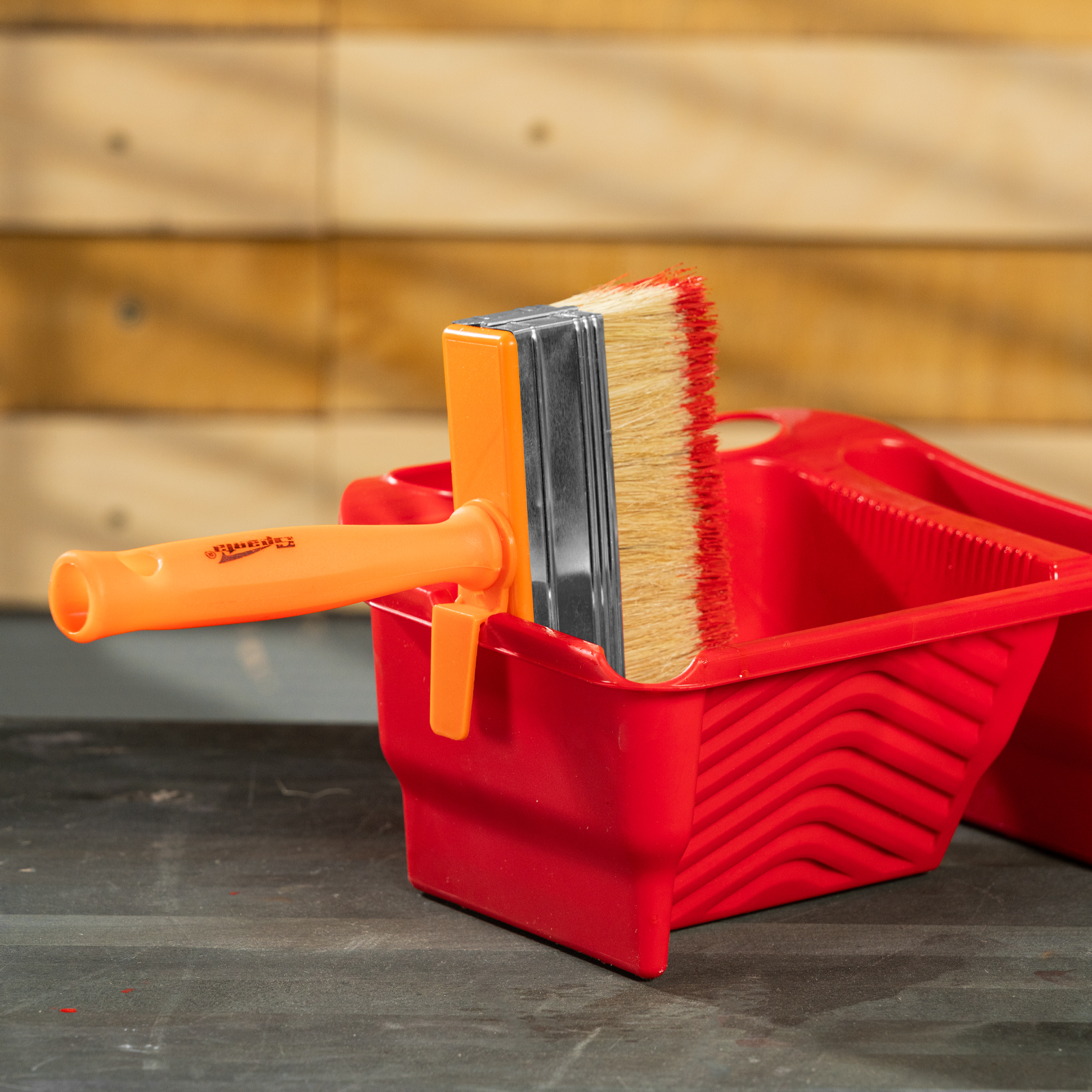 - Продуманная конструкция — во время перерыва в работе кисть можно закрепить на краю емкости с краской.