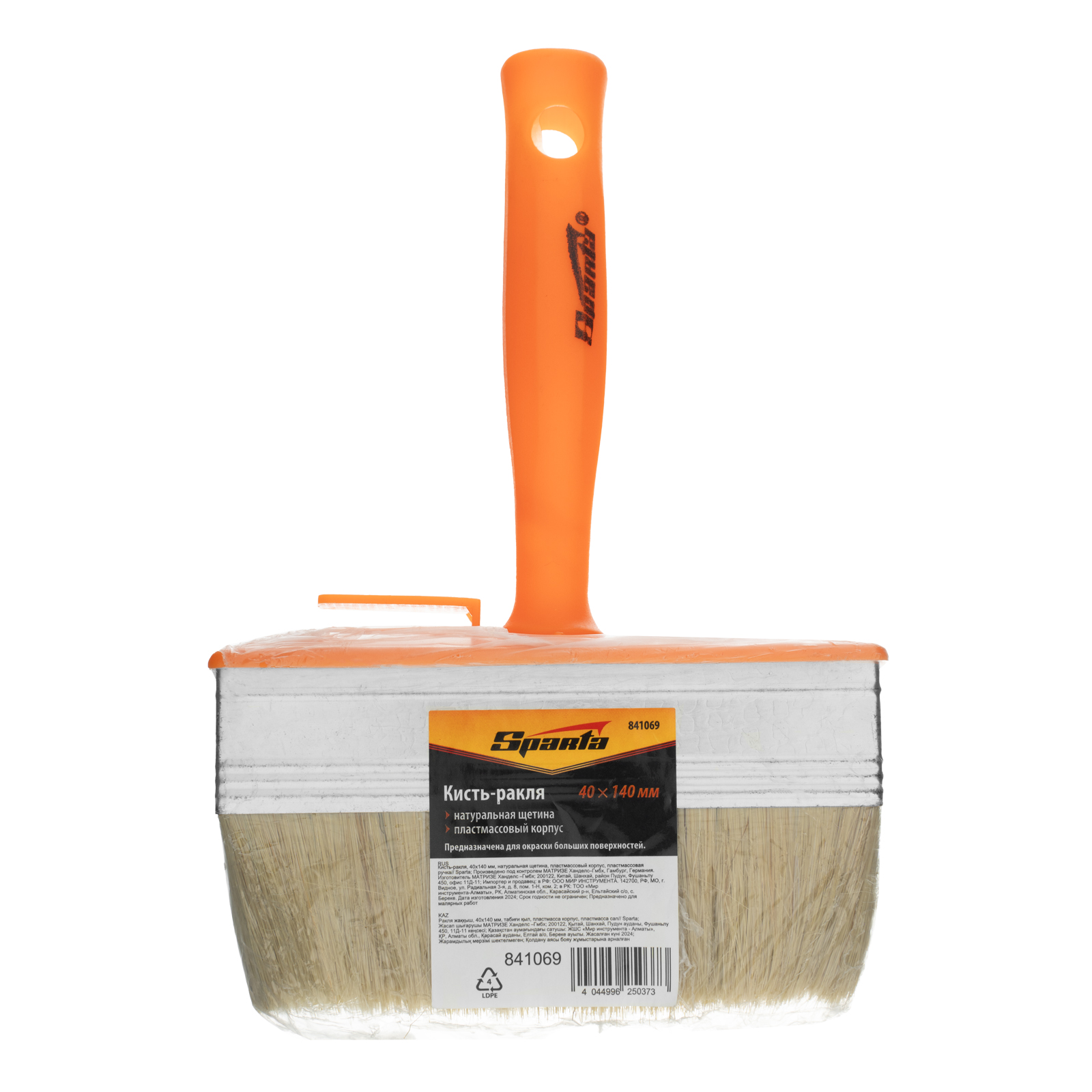 Кисть-ракля Sparta 841069 толщиной 40 мм и шириной 140 мм, с натуральной щетиной, пластмассовыми корпусом и ручкой, используется для малярных работ на участках большой площади, поэтому удобна для обработки стен, потолков и фасадов. Натуральная щетина устойчива к химическому воздействию, поэтому не деформируется и сохраняет упругость при работе с ЛКМ на водной основе, грунтовками, масляными красками и клеящими составами.