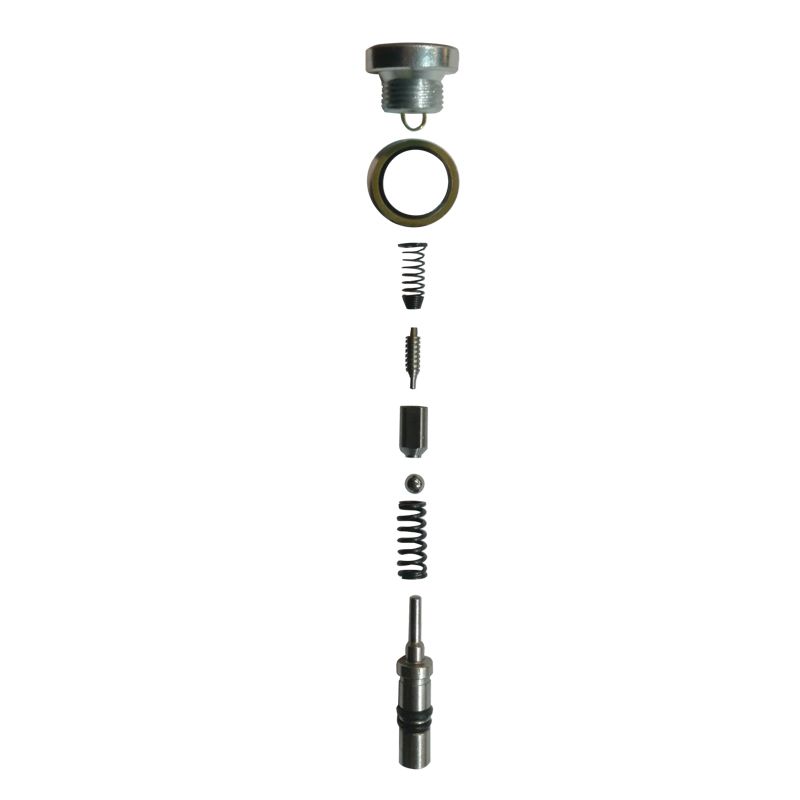 Клапан в сборе для гидравлических тележек JC20. 8 деталей: пробка клапана – длина 18 мм, диаметр 28 мм; шайба диаметром 30 мм; конусная пружина – диаметр наименьший 7 мм, длина 22 мм; шток седла клапана – диаметр 5 мм, длина 19 мм; седло клапана – диаметр 9 мм, длина 16 мм; металлический шарик диаметром 6 мм; пружина – длина 25 мм, диаметр 9 мм; шток клапана – длина 47 мм, диаметр 10 мм.