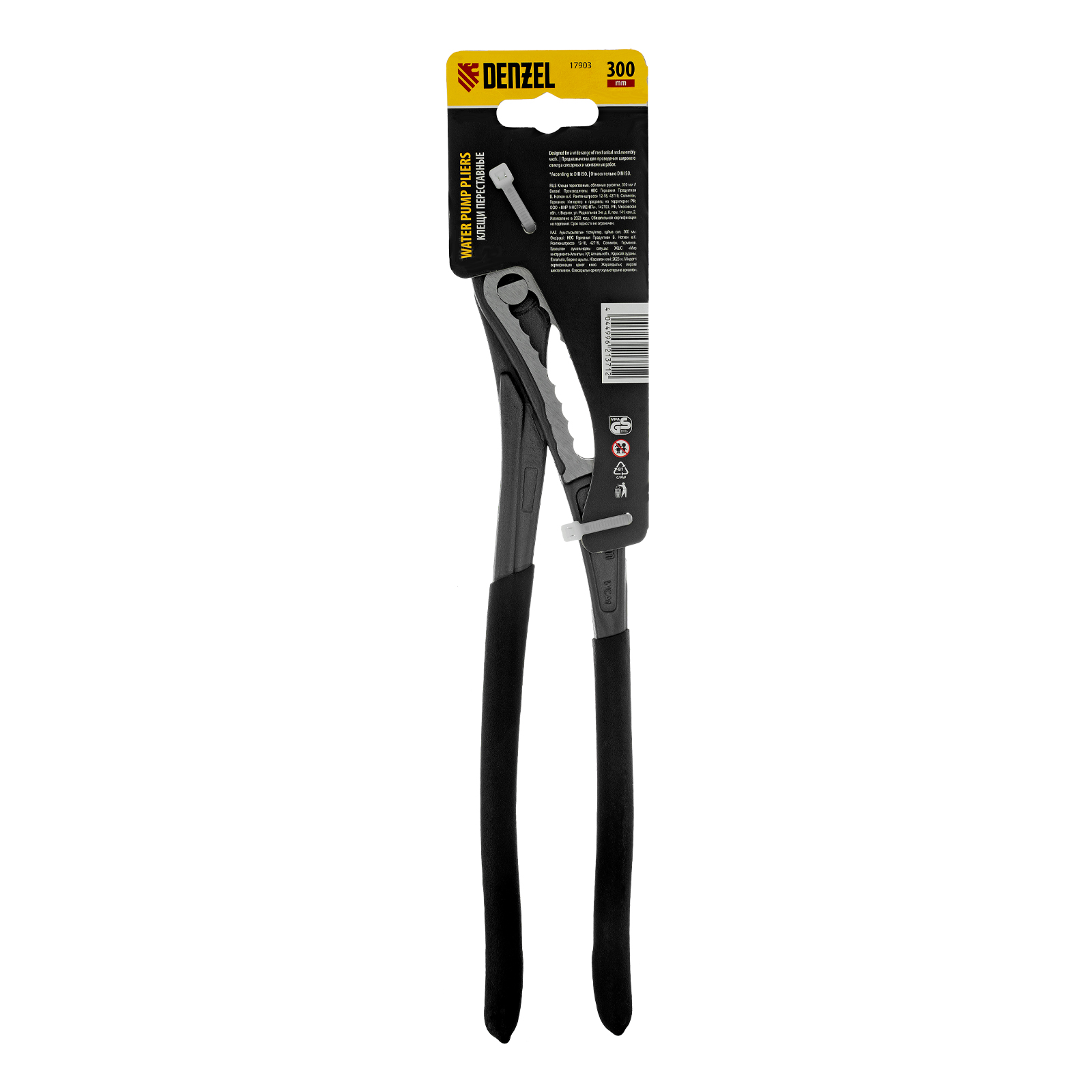 Переставные клещи Denzel 17903 длиной 300 мм, с обливными рукоятками, предназначены для фиксации и вращения деталей и заготовок различной формы. Подходят для захвата фитингов, труб, крепежных элементов. Инструмент используется при проведении ремонтных, монтажных, сантехнических работ.