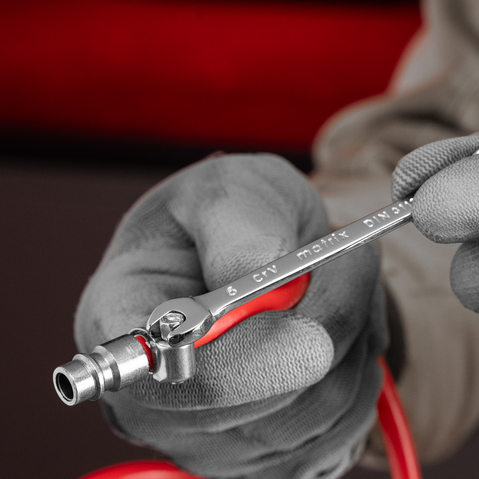 Комбинированный ключ Matrix 15150 размером 6 мм, из стали CrV, с покрытием «полированный хром», пригодится во время ремонтных работ дома или в гараже. С его помощью можно быстро монтировать и демонтировать крепежные элементы. Угол наклона кольцевого зева относительно плоскости инструмента составляет 15°, поэтому ключом удобно работать в труднодоступных местах.