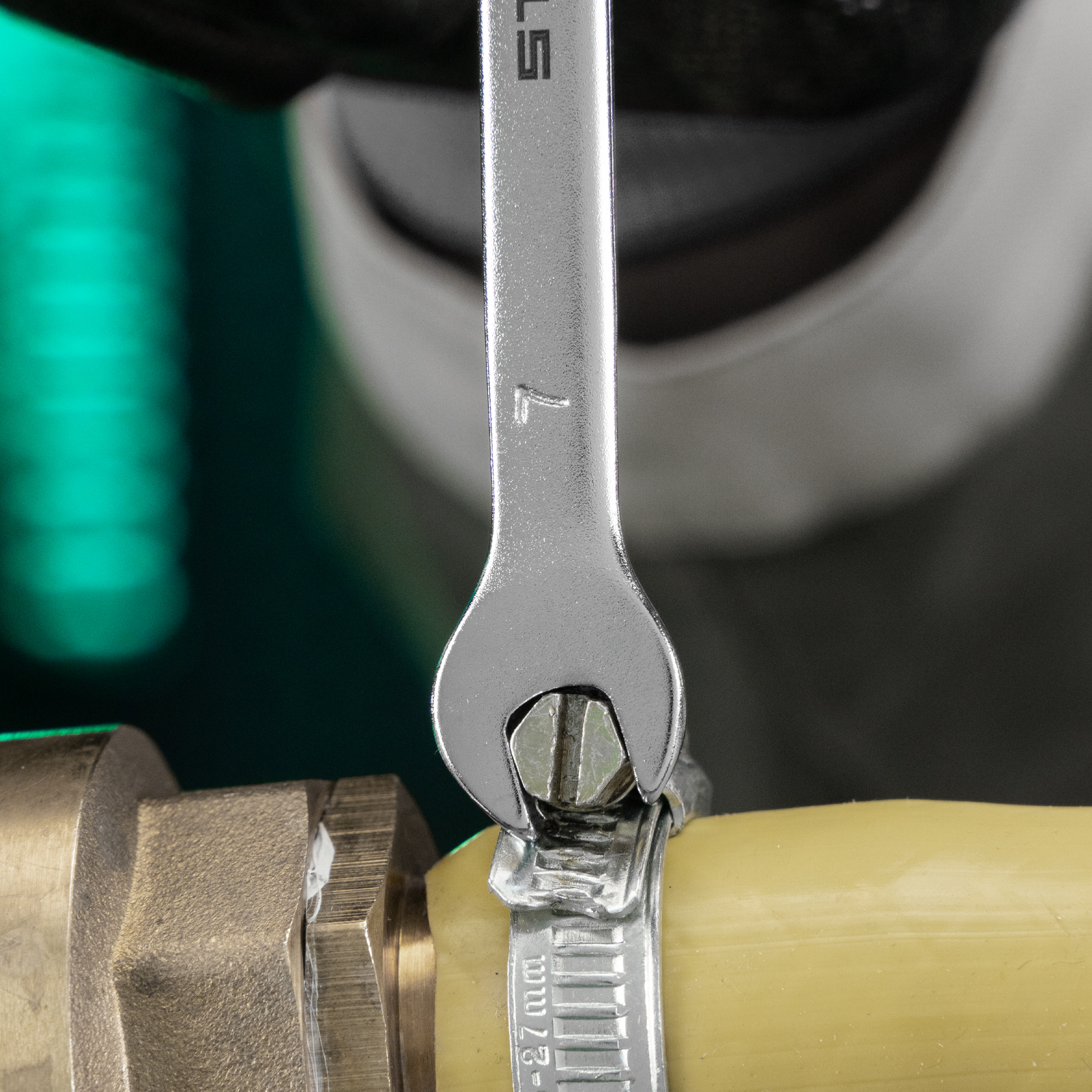 Комбинированный ключ Stels 15203 из стали CrV, 7 мм, покрытый матовым хромом, используется для закручивания и откручивания гаечных и болтовых соединений. Накидная головка имеет 12-гранную внутреннюю поверхность, что облегчает работу с крепежом и уменьшает опасность его повреждения. Ключ применяется в слесарных мастерских и автосервисах, а также будет полезен для решения бытовых задач.