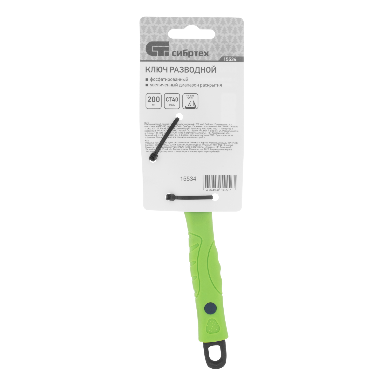 Ключ разводной, 200 мм, тонкие губки, фосфатированый Сибртех