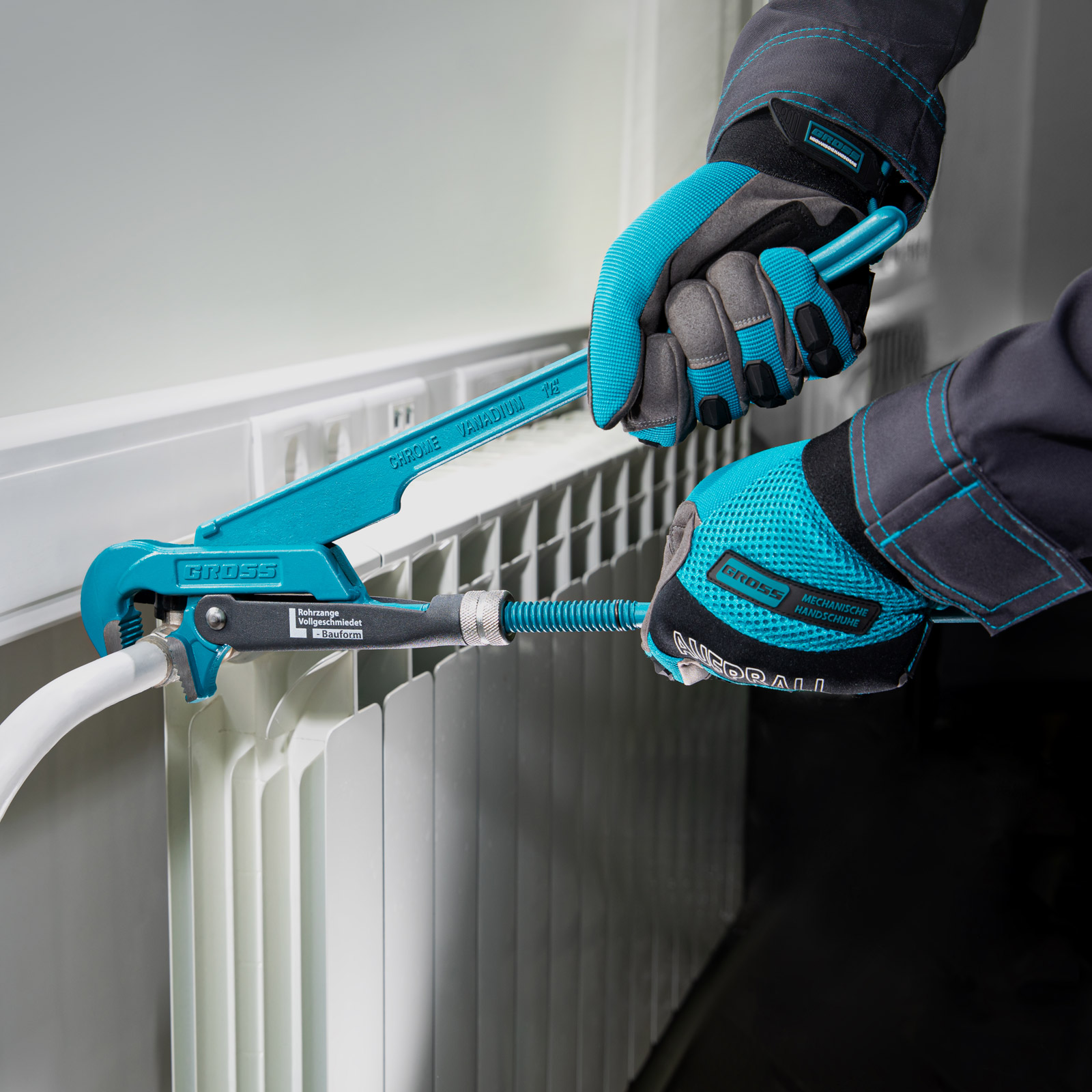 - Самоблокируемый захват труб и деталей — зубья прогрессивной формы наклонены против направления вращения.