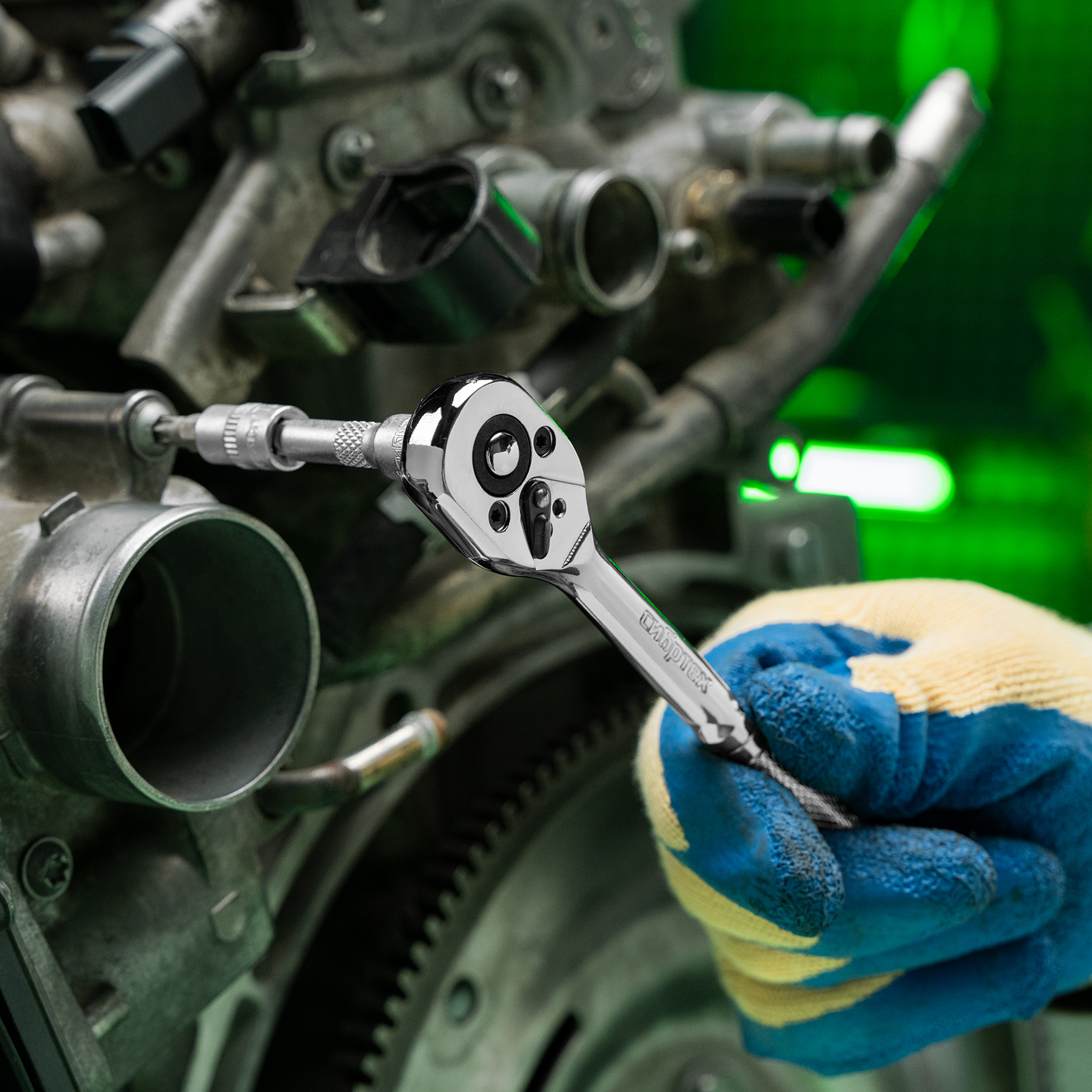 - Надежная фиксация — шариковый замок крепко удерживает торцевую головку, поэтому она не соскочит во время работы.